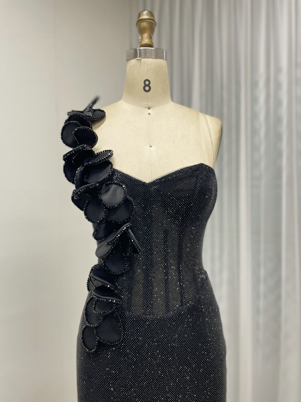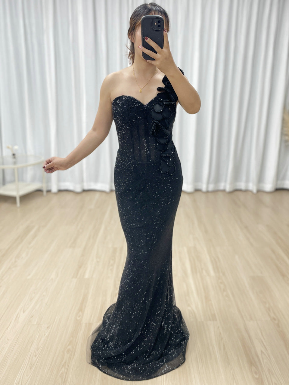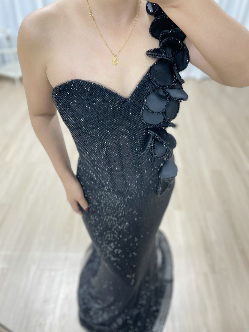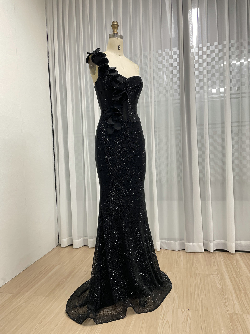 Sexy One Shoulder Sweetheart Neck Bodice Black Evening Gown Suitable for Banquet MB40359