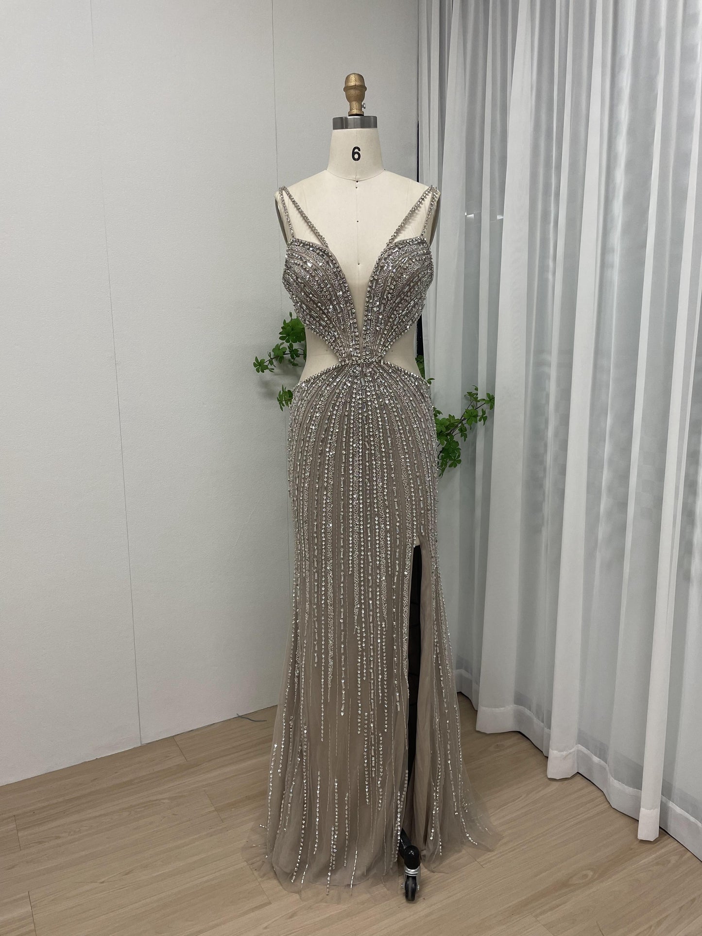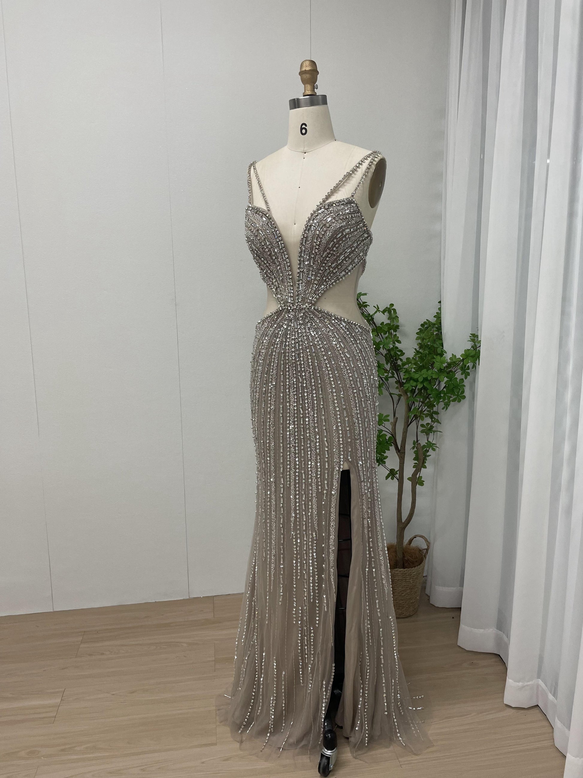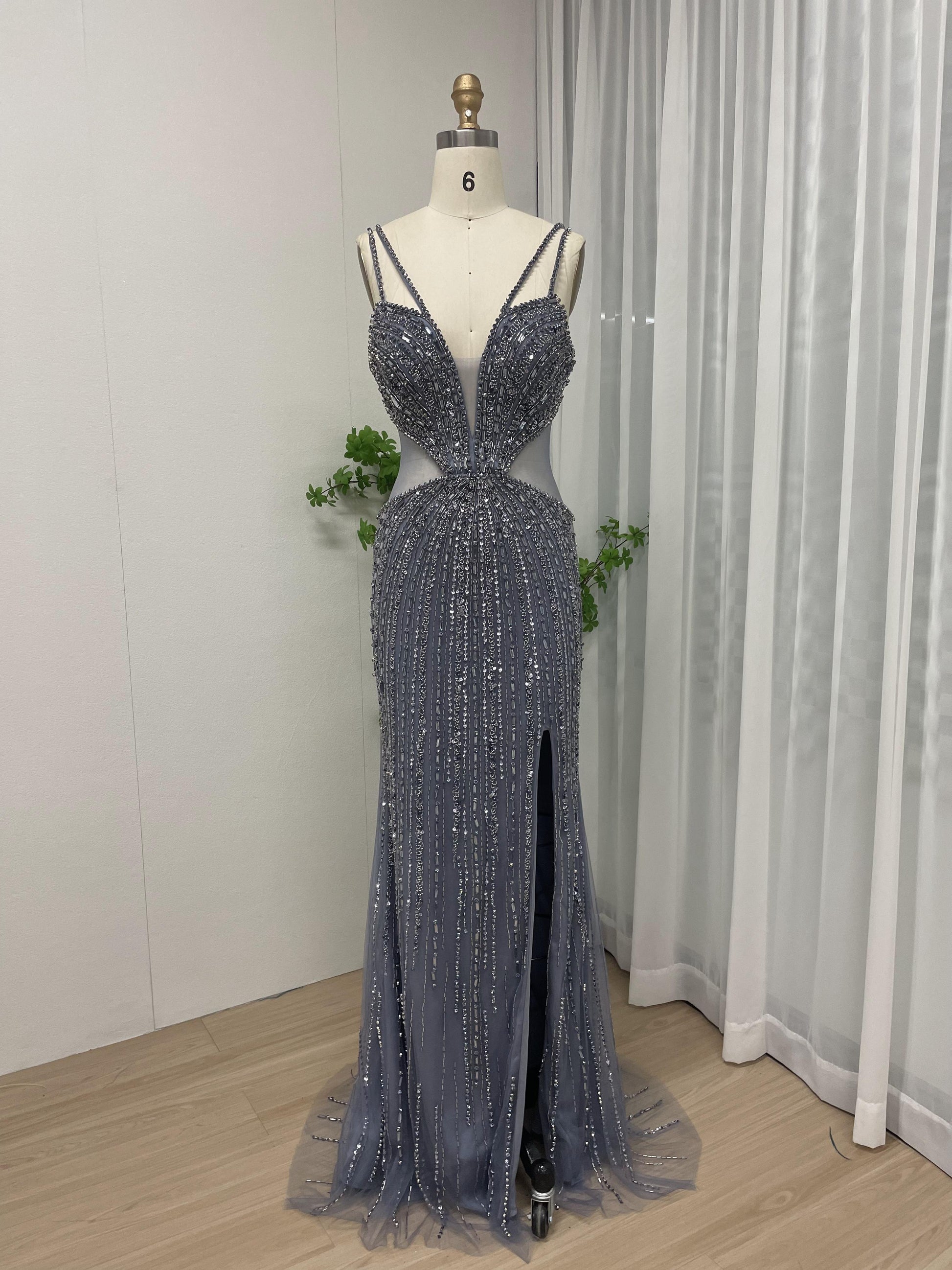 Sexy Spaghetti Strap Handmade Beading High Split Party Evening Dress MB40040-2