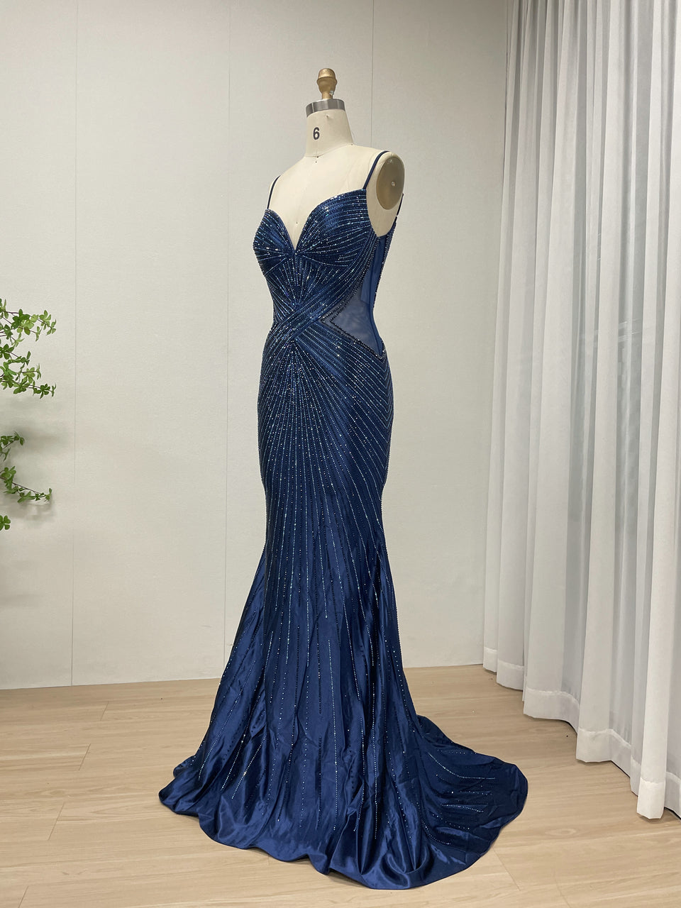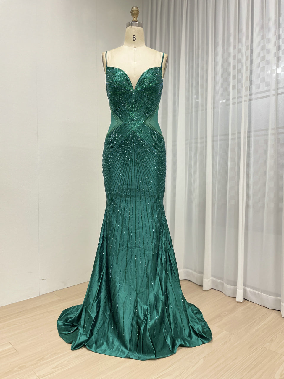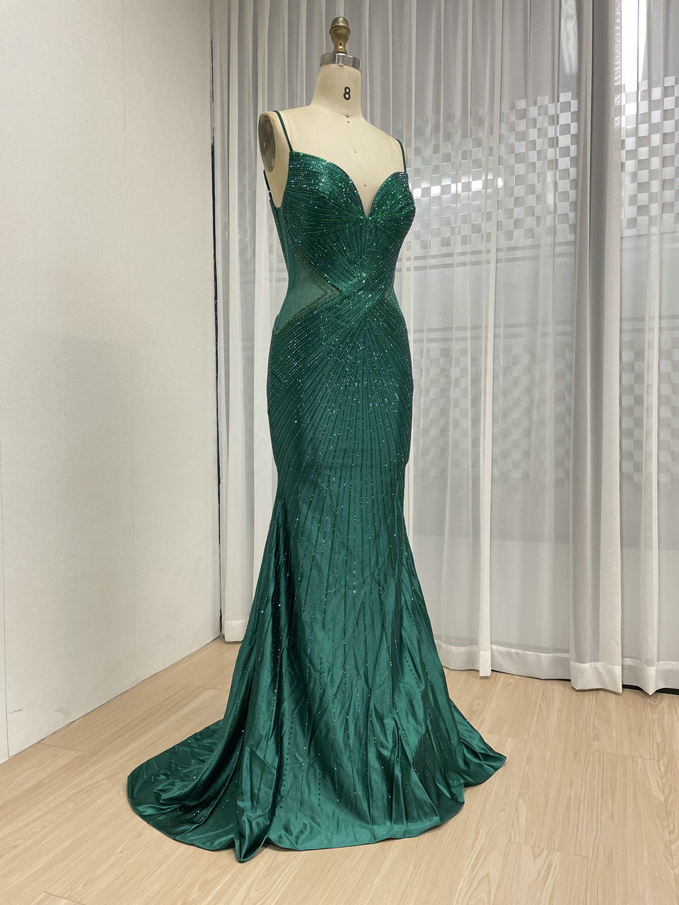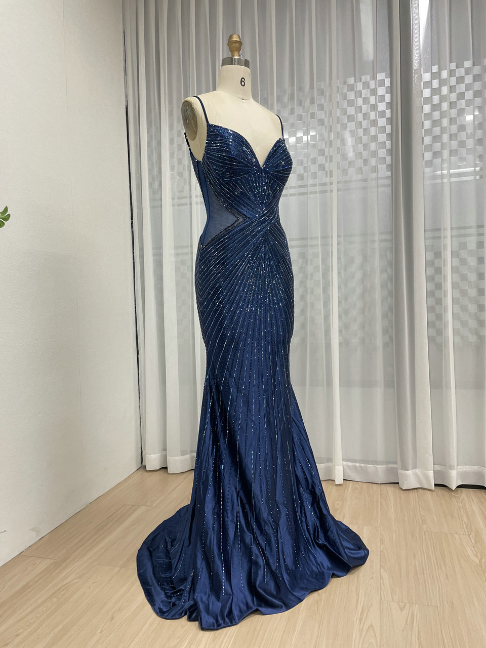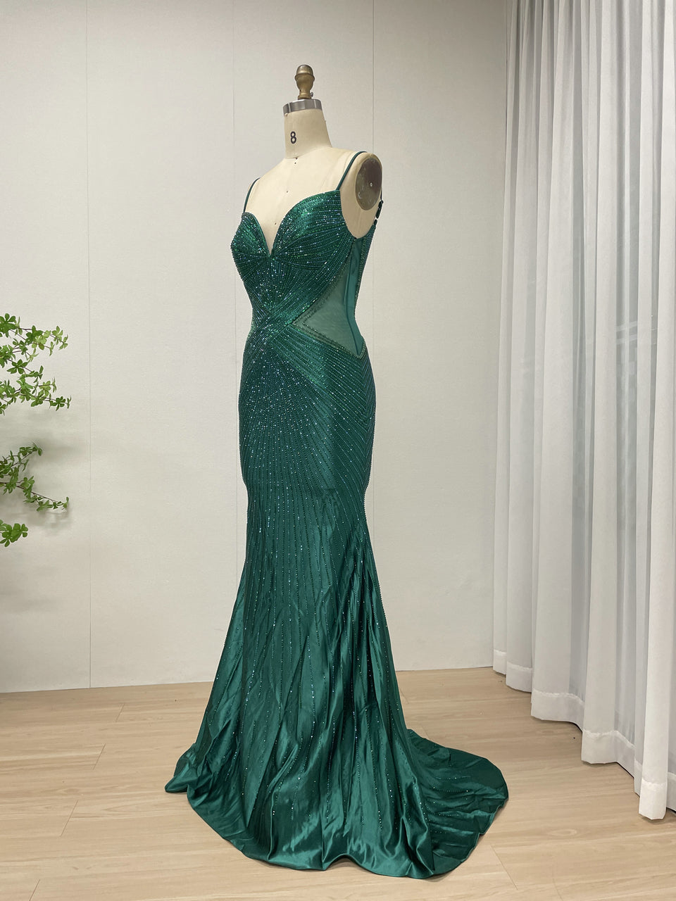 Sexy Spaghetti Strap V Neck Sheer Waist Mermaid Prom Evening Gown for Formal MB40428