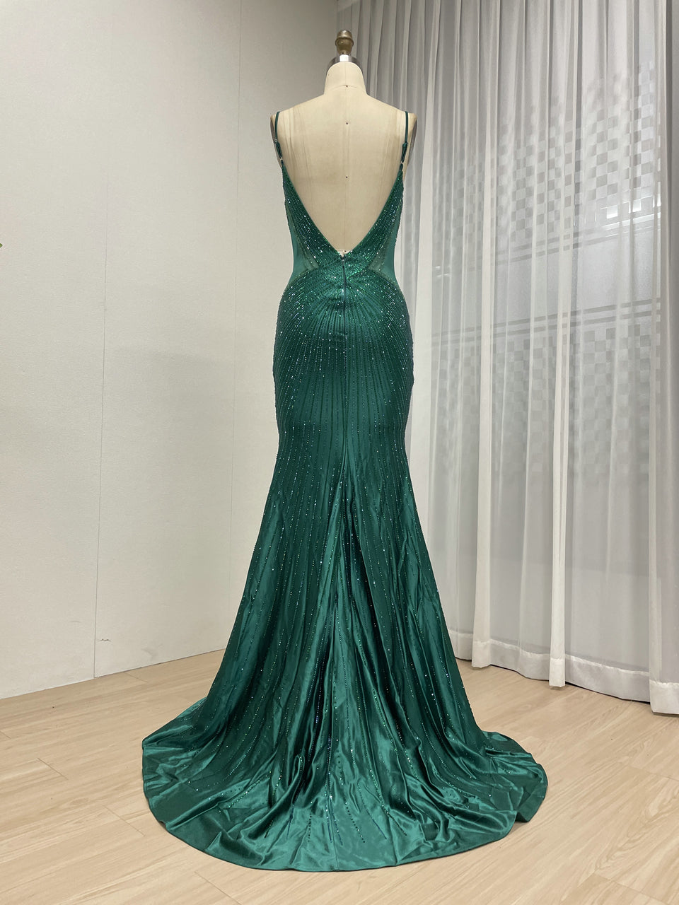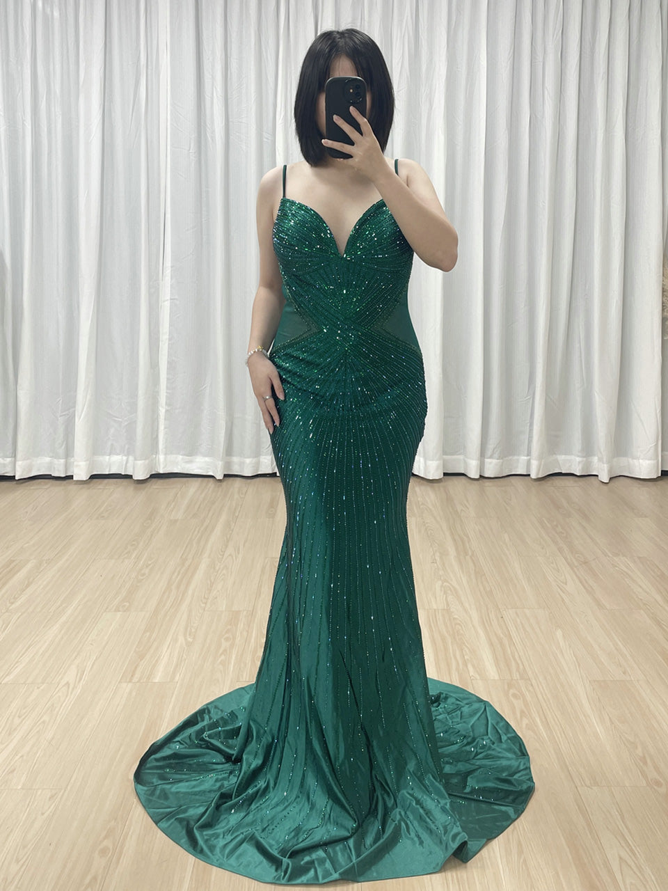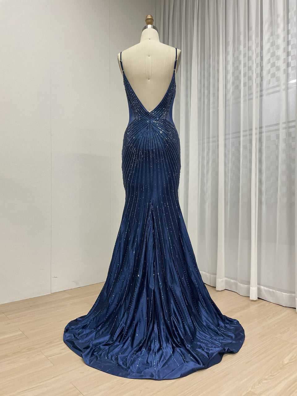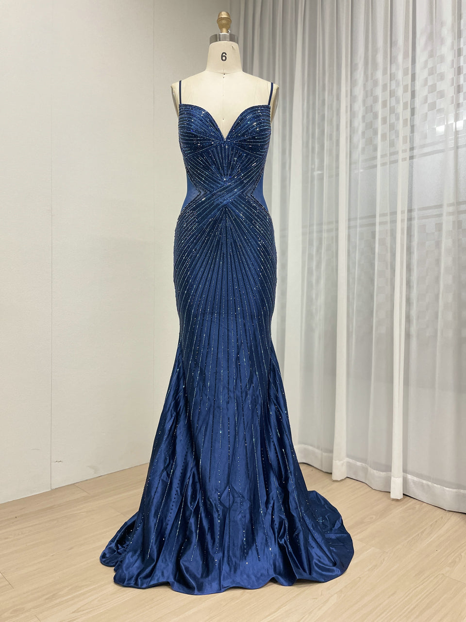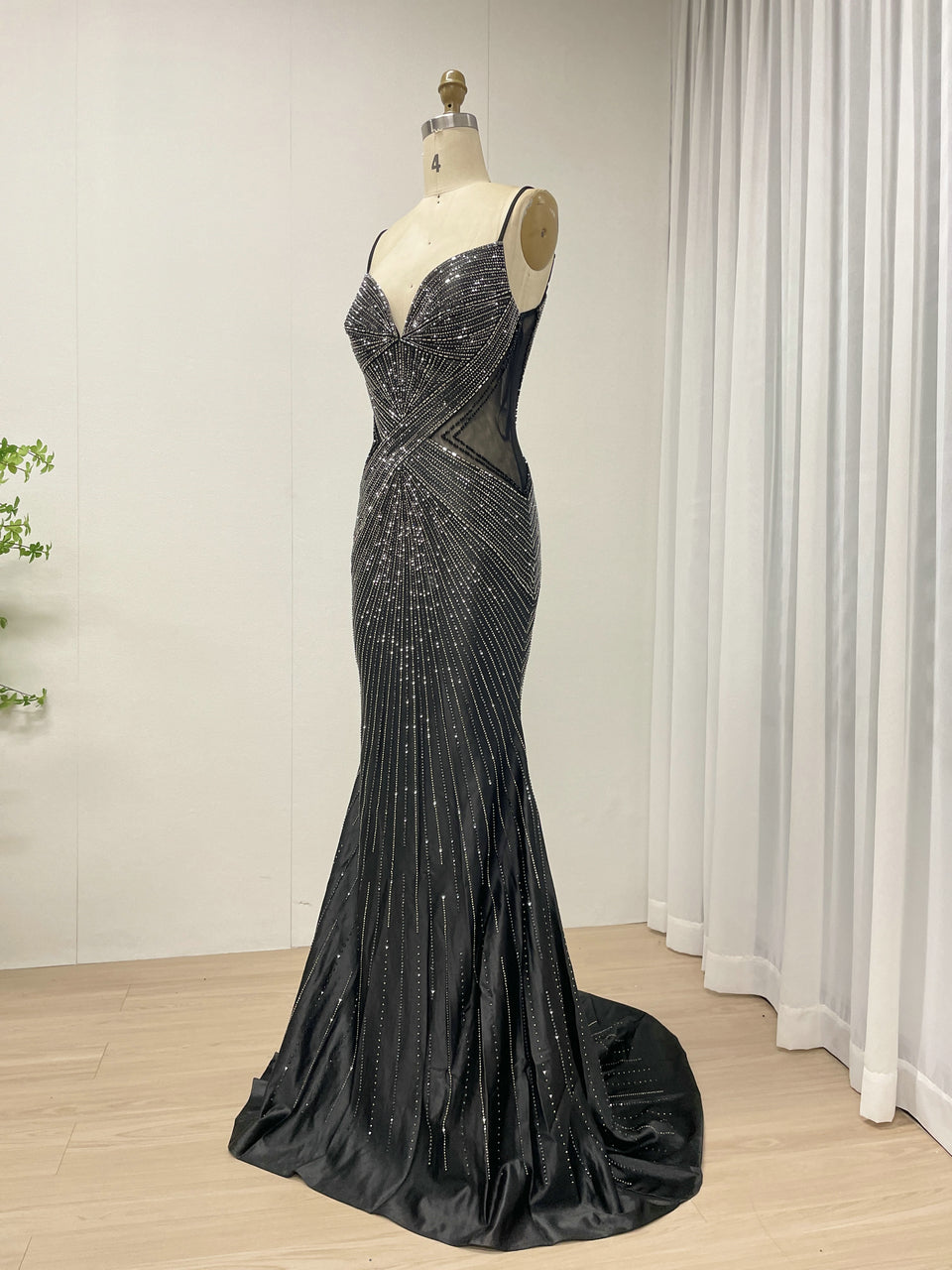 Sexy Spaghetti Strap V Neck Sheer Waist Mermaid Prom Evening Gown for Formal MB40428