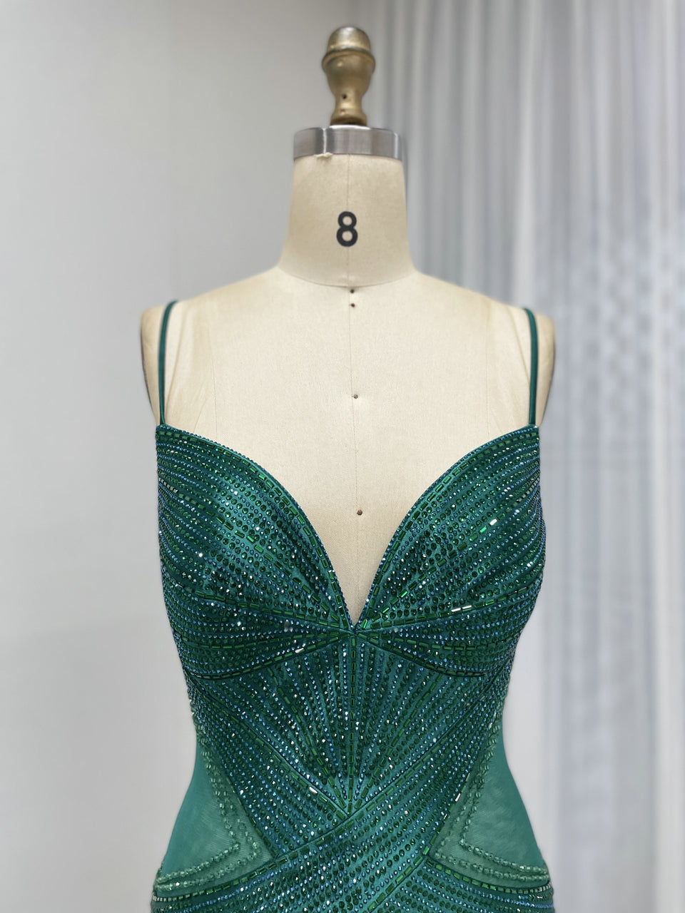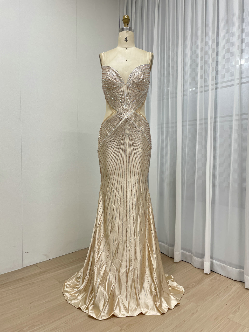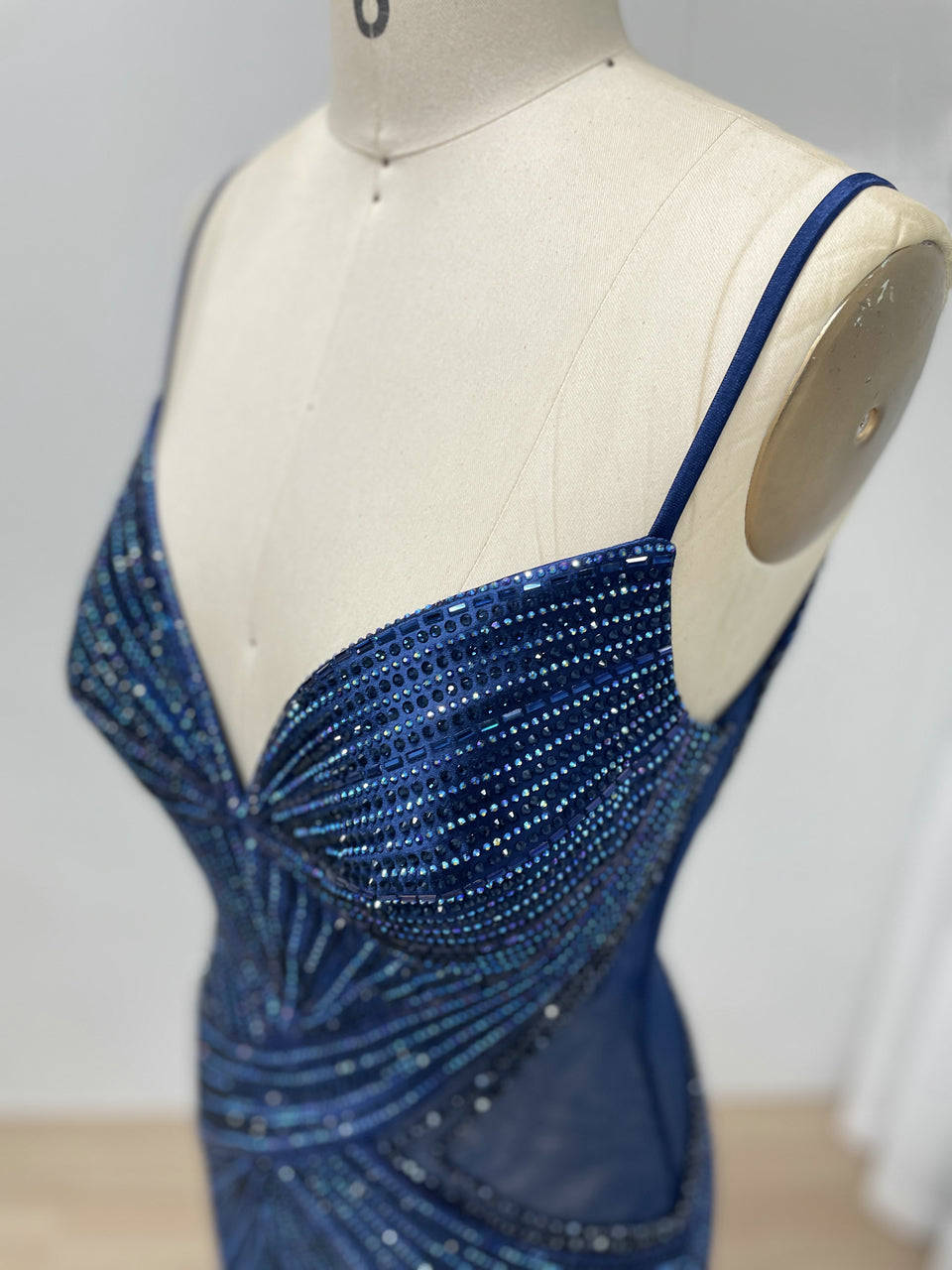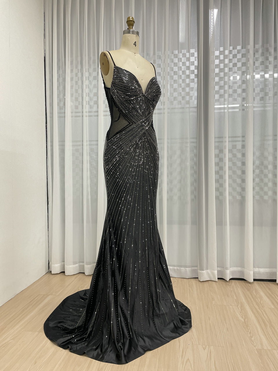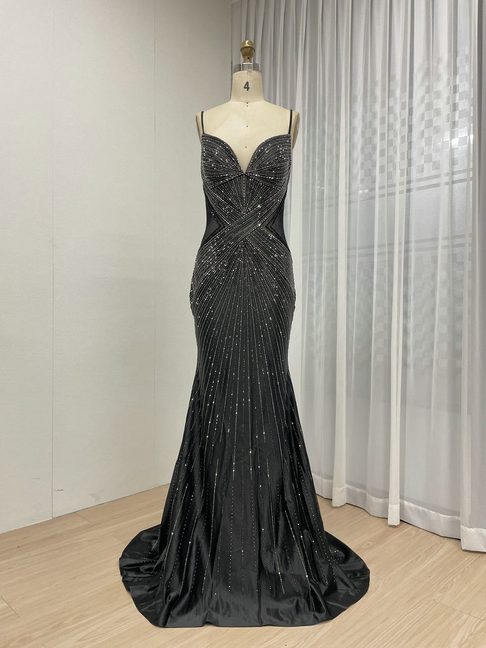 Sexy Spaghetti Strap V Neck Sheer Waist Mermaid Prom Evening Gown for Formal MB40428
