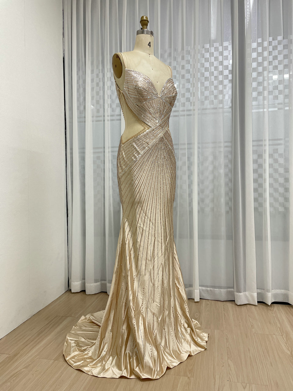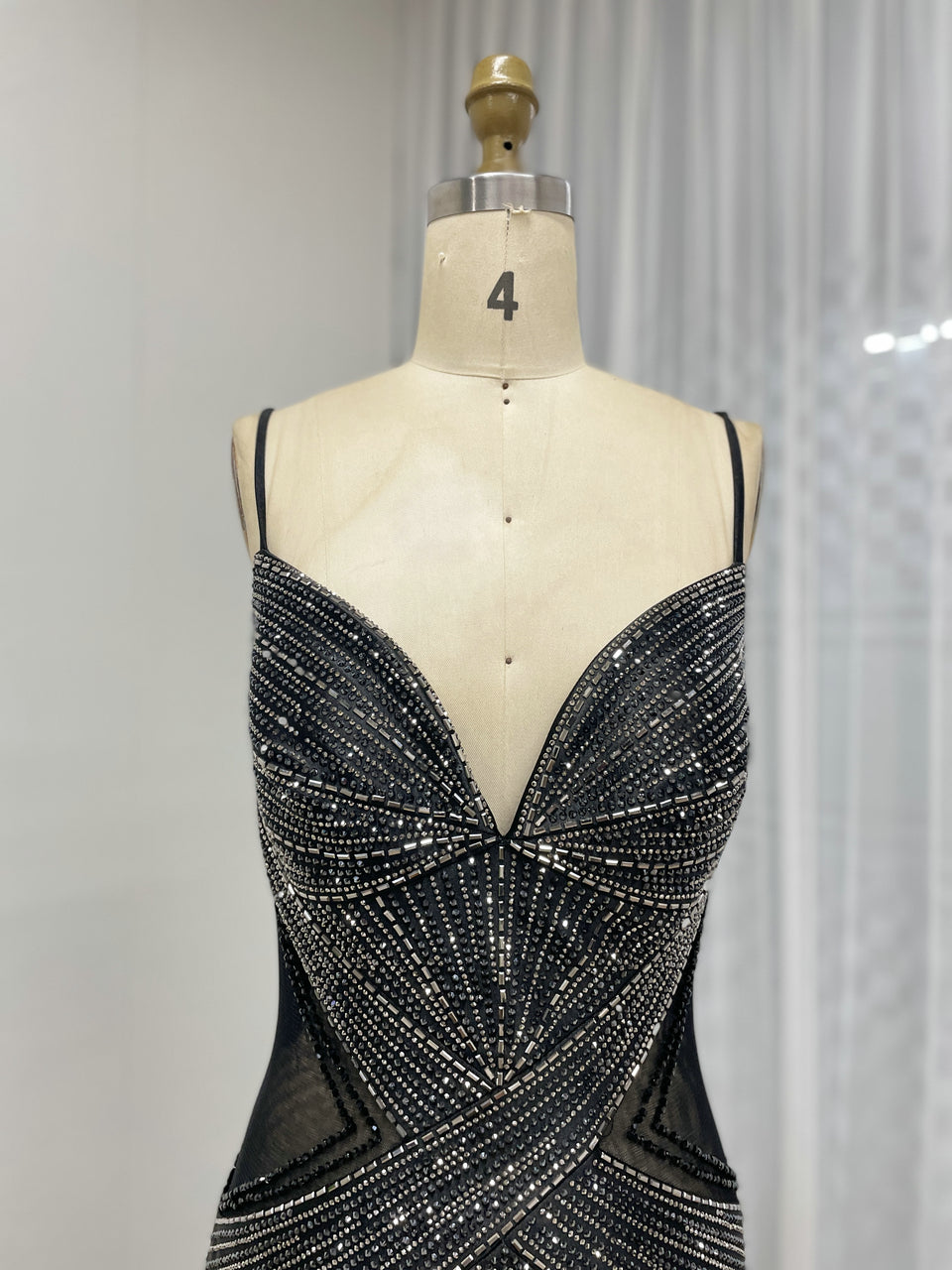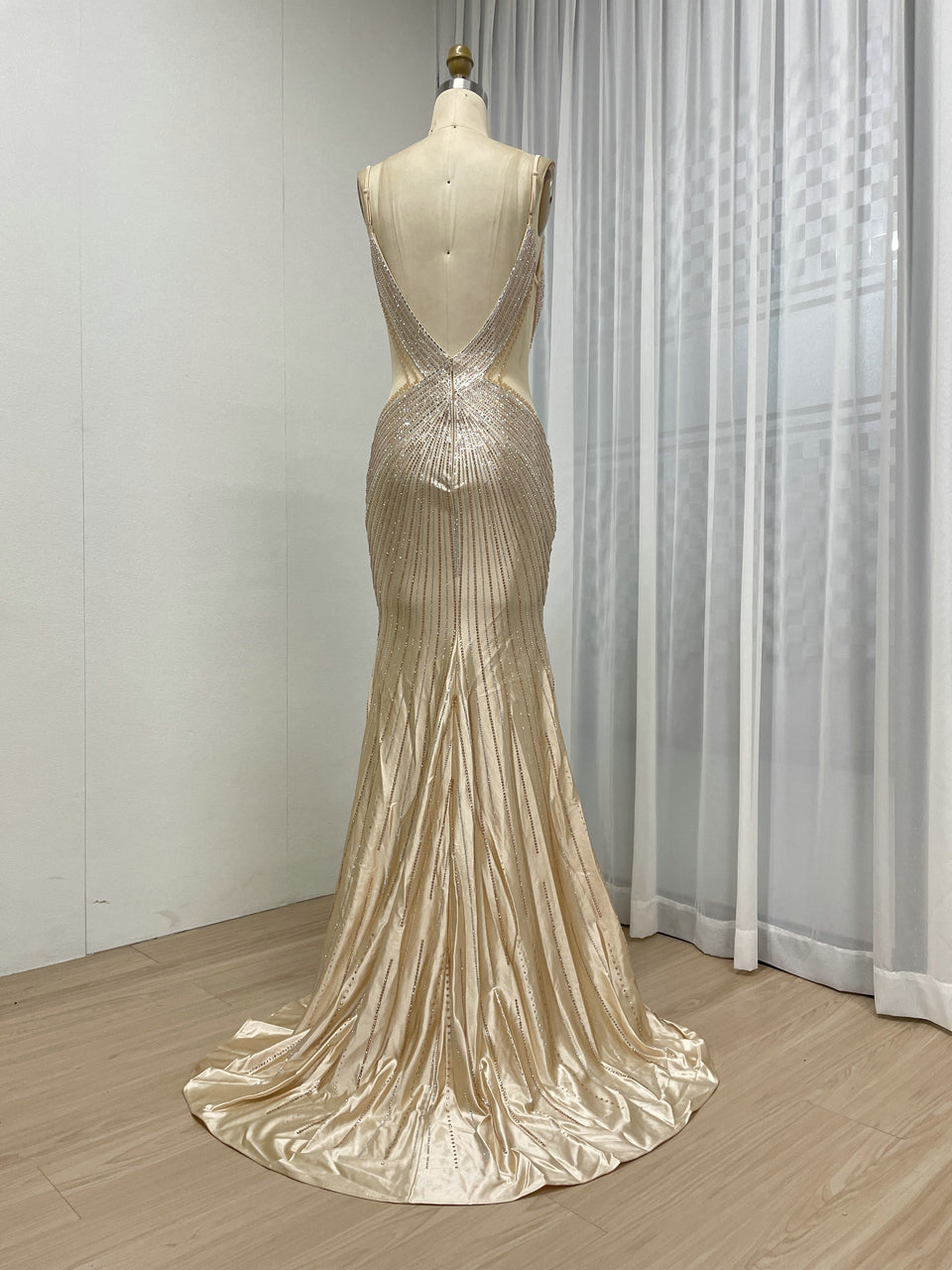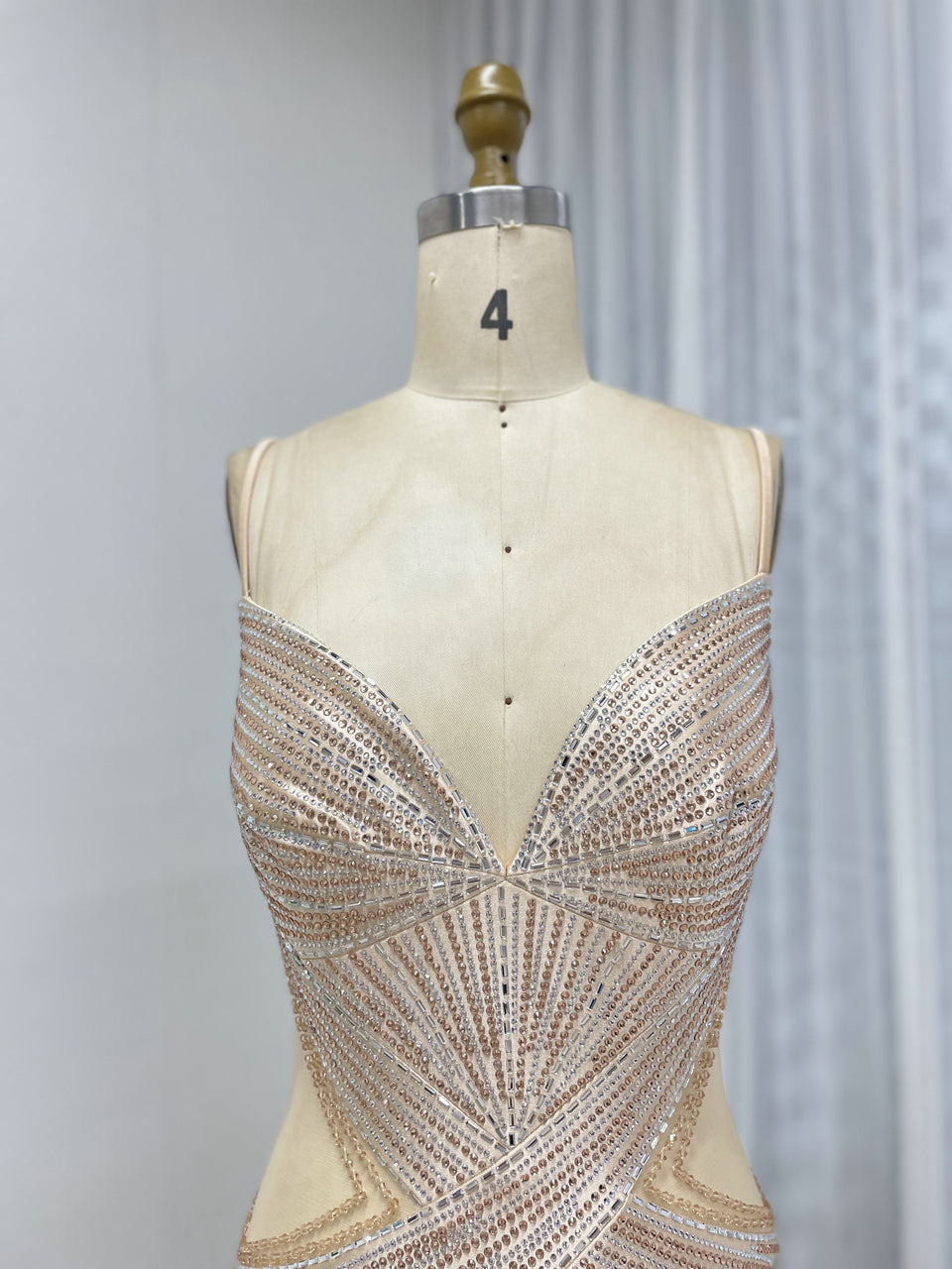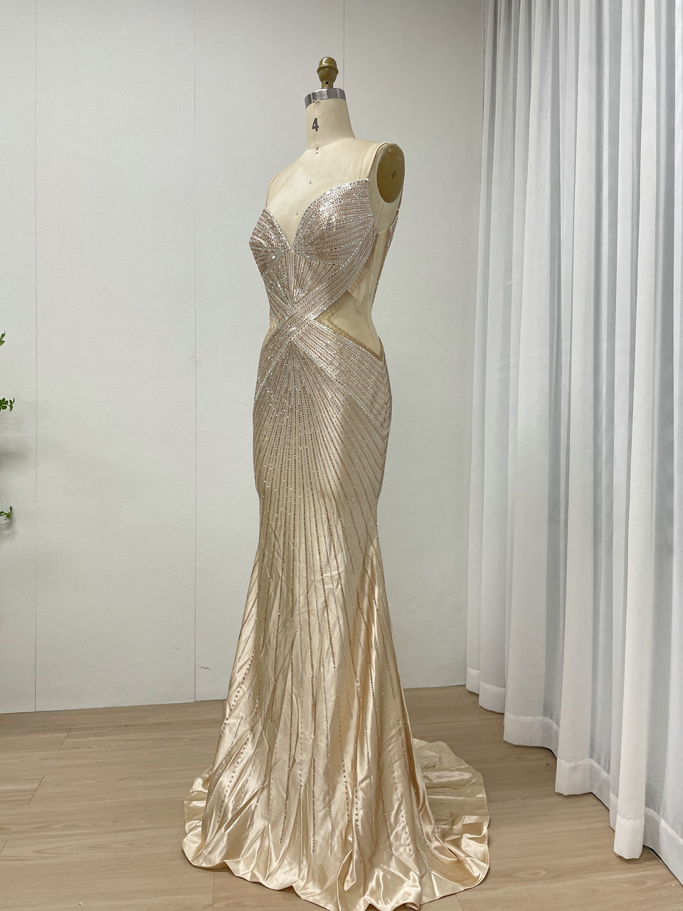 Sexy Spaghetti Strap V Neck Sheer Waist Mermaid Prom Evening Gown for Formal MB40428