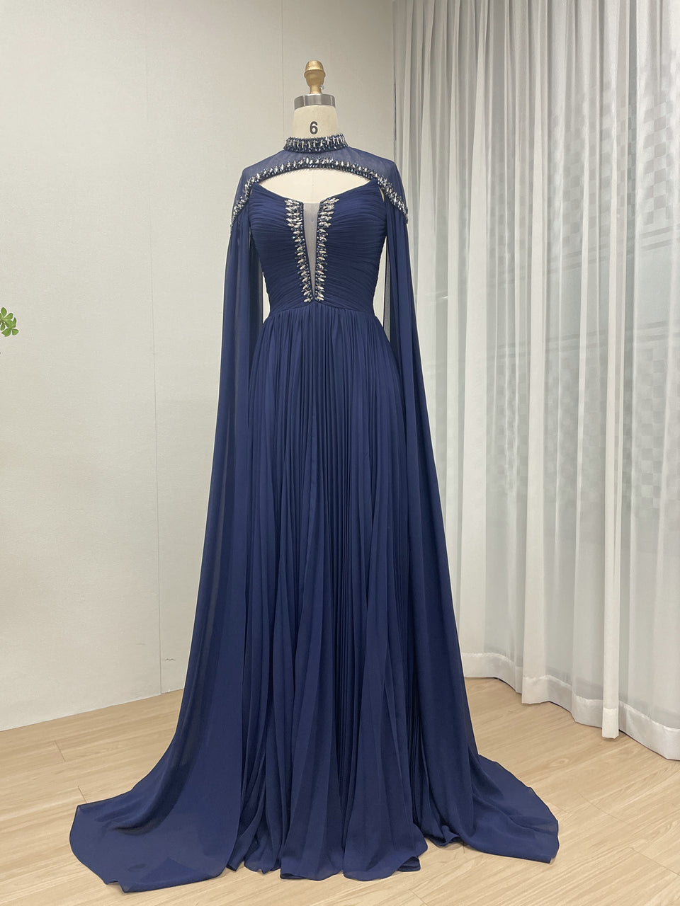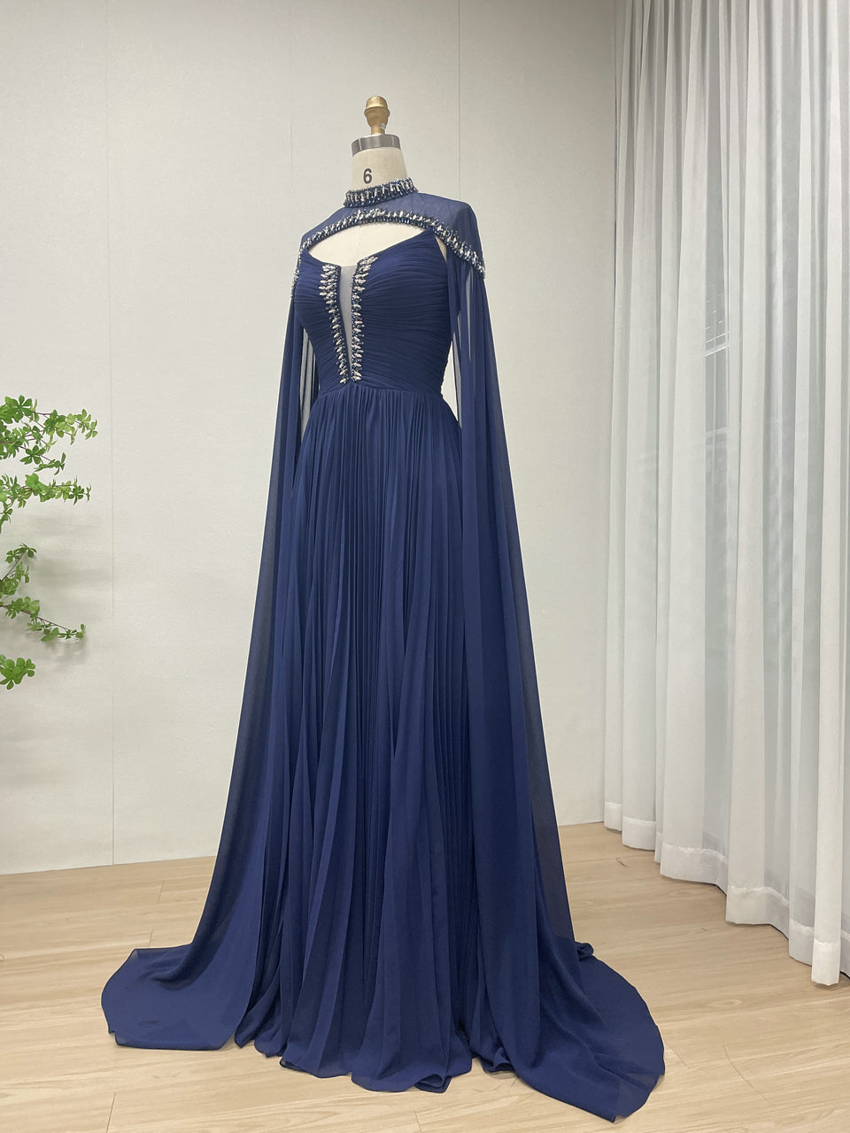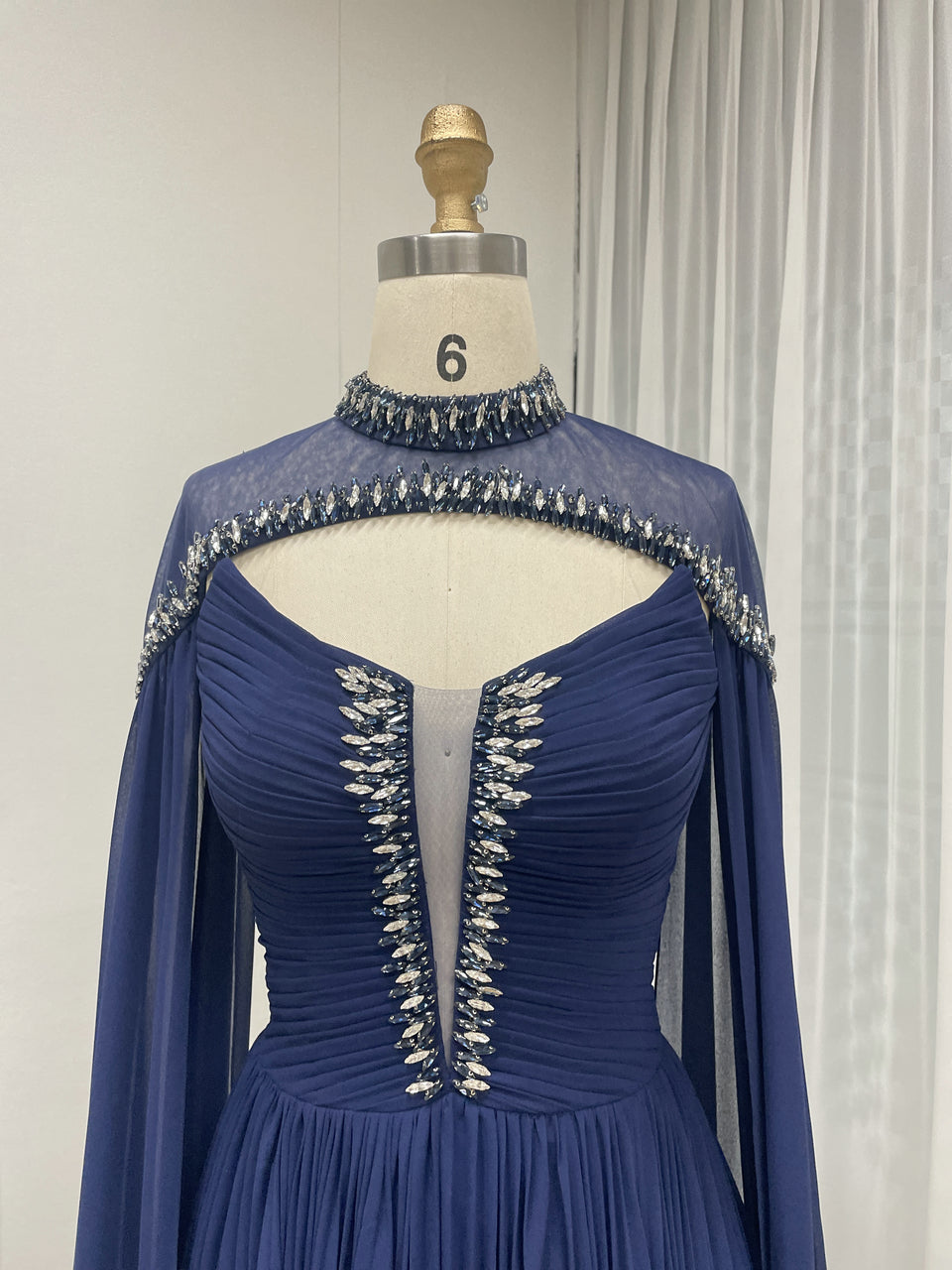 Sexy V Neck beading Blue Muslim Long Sleeve Dress With Detachable Cap Sleeve MB40313