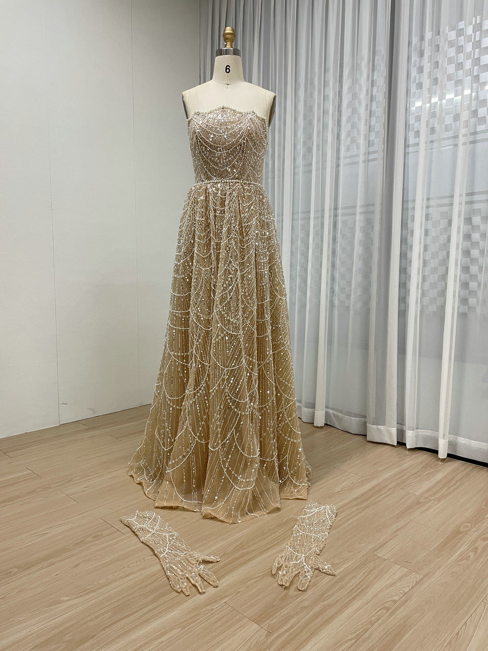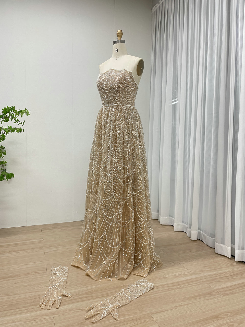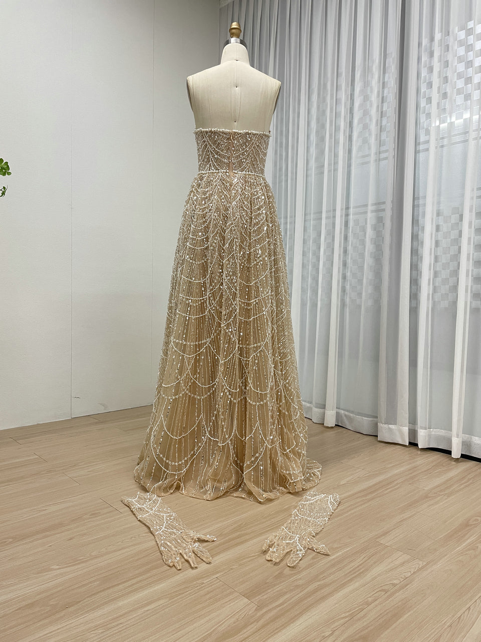 Shiny Gold Beaded Dress Strapless Gloves Train Party Style MY30067-2