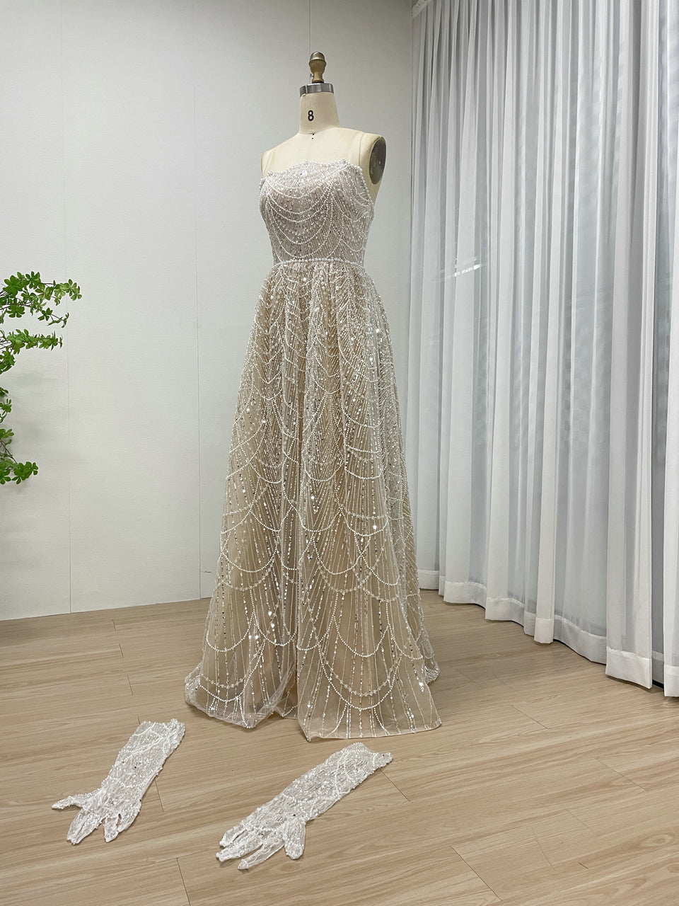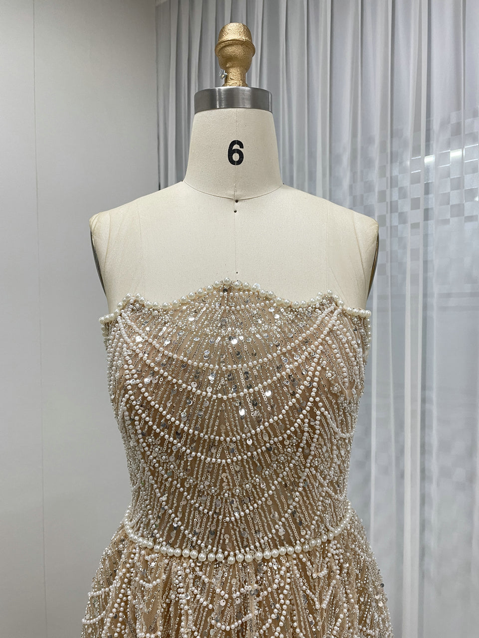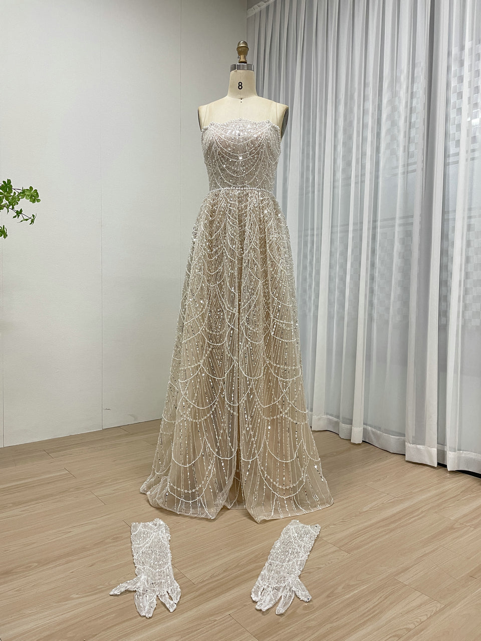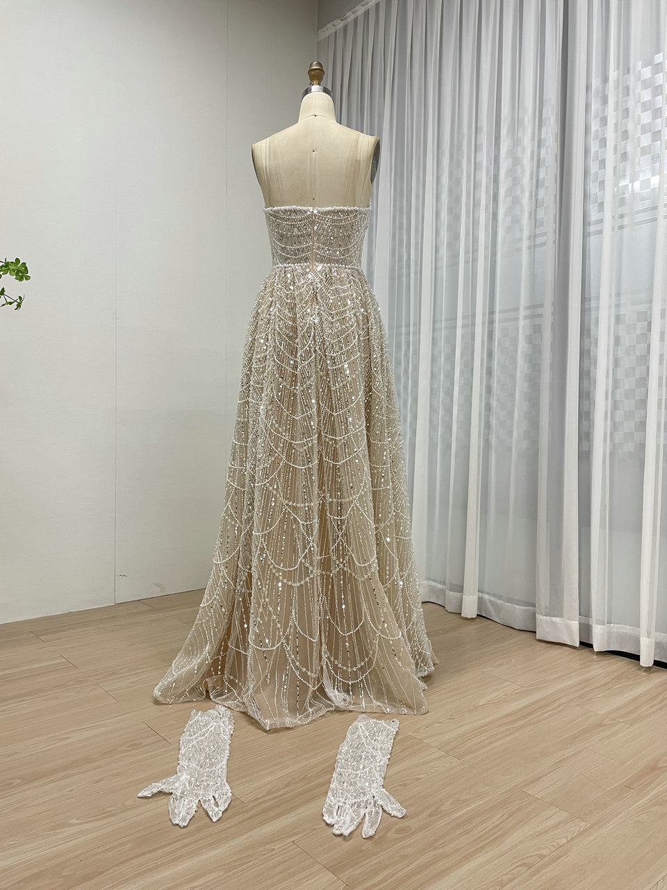 Shiny Gold Beaded Dress Strapless Gloves Train Party Style MY30067-2