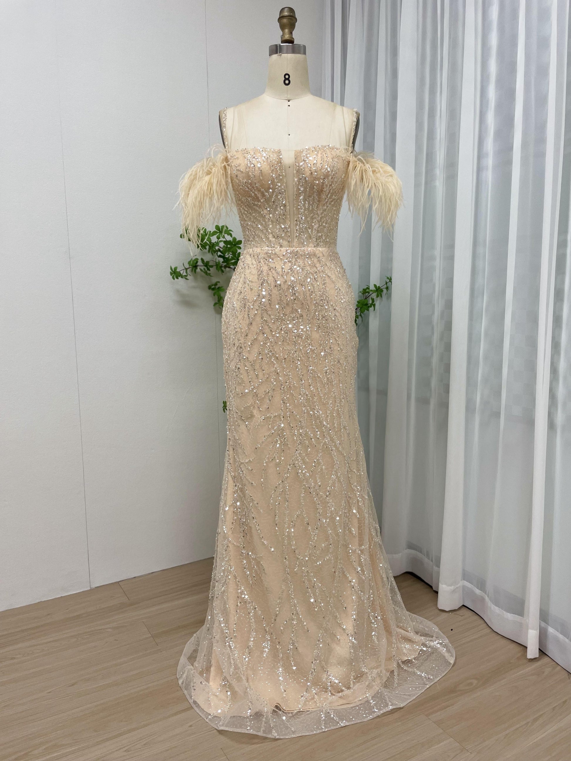 Spaghetti Strap Off Shoulder Feather Beading Lace Dress MB40128