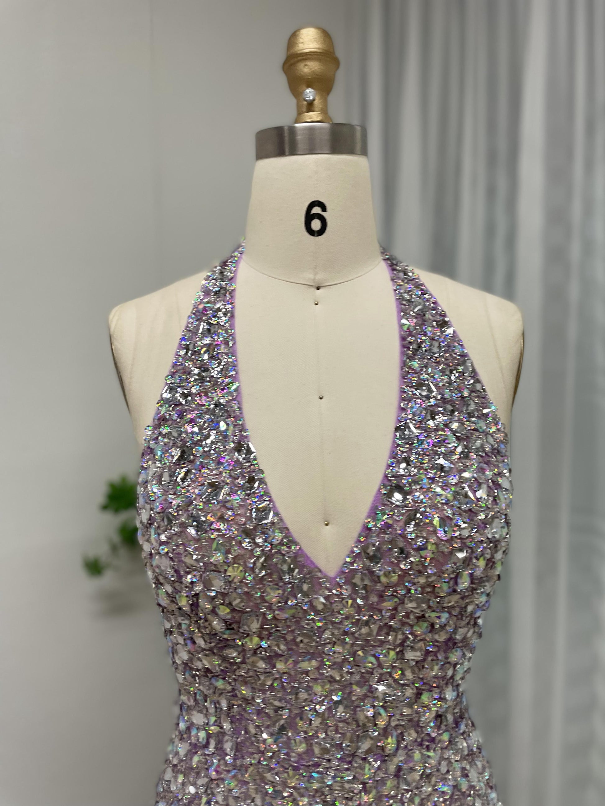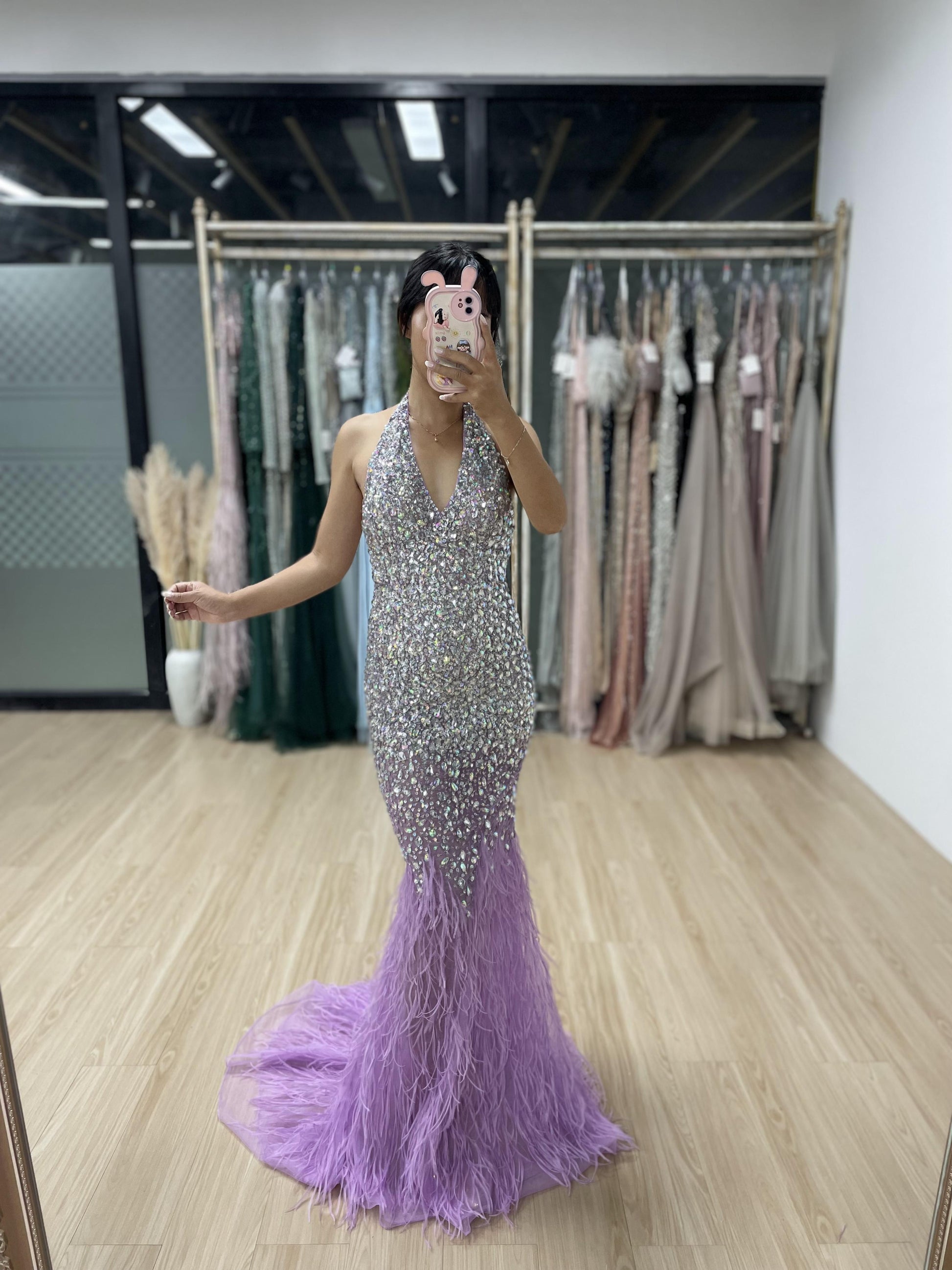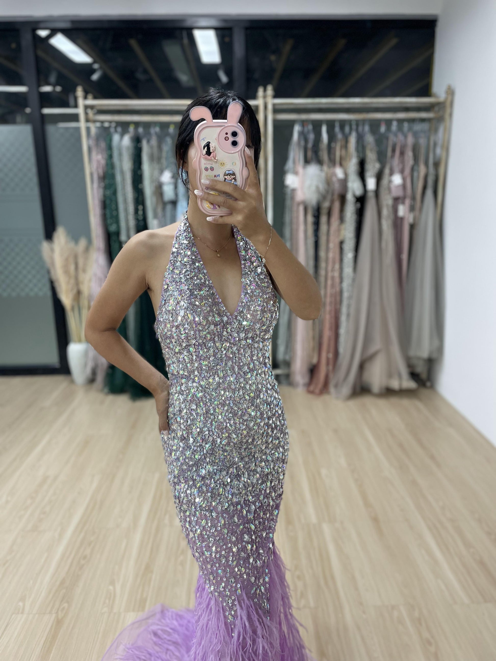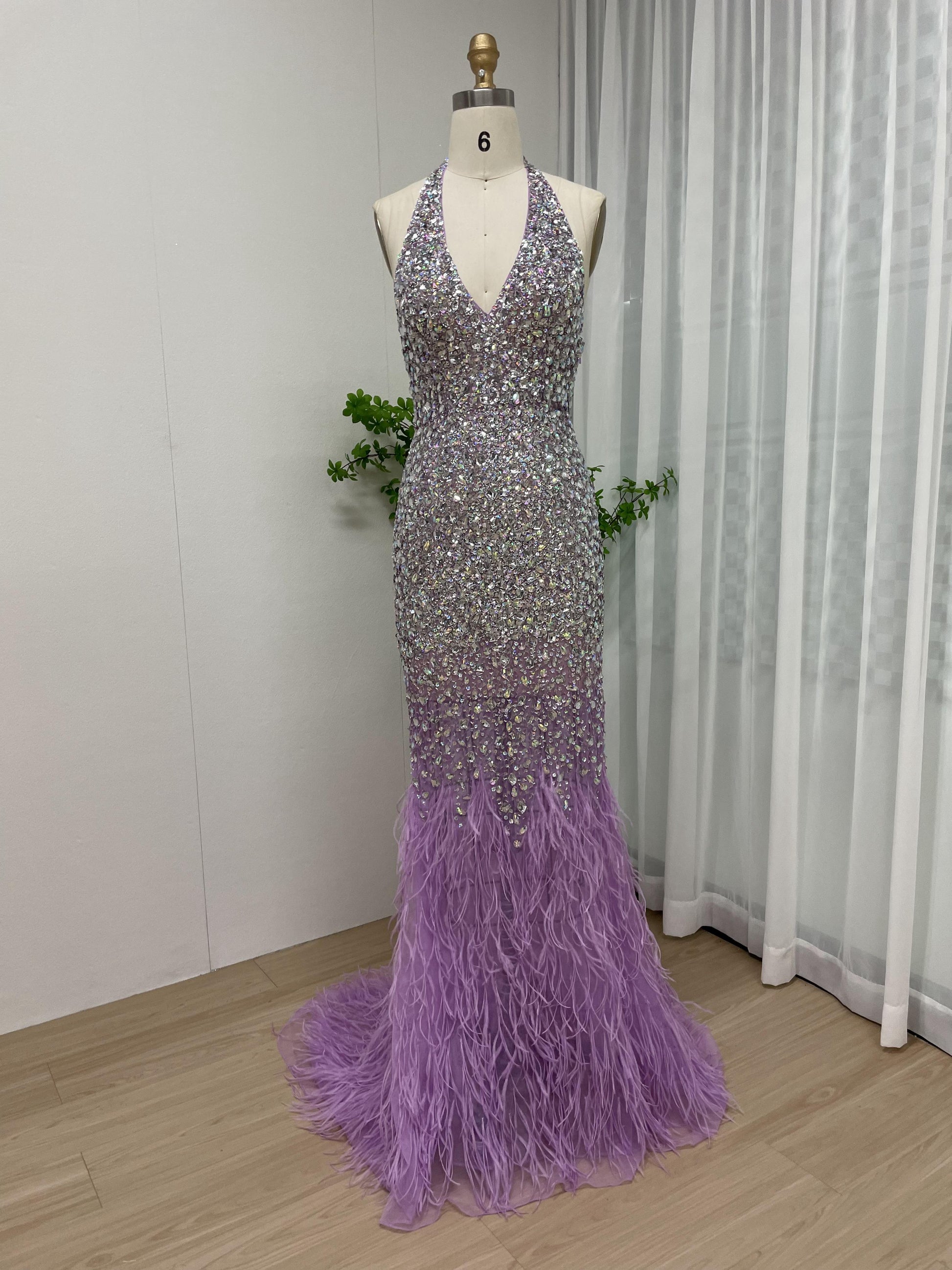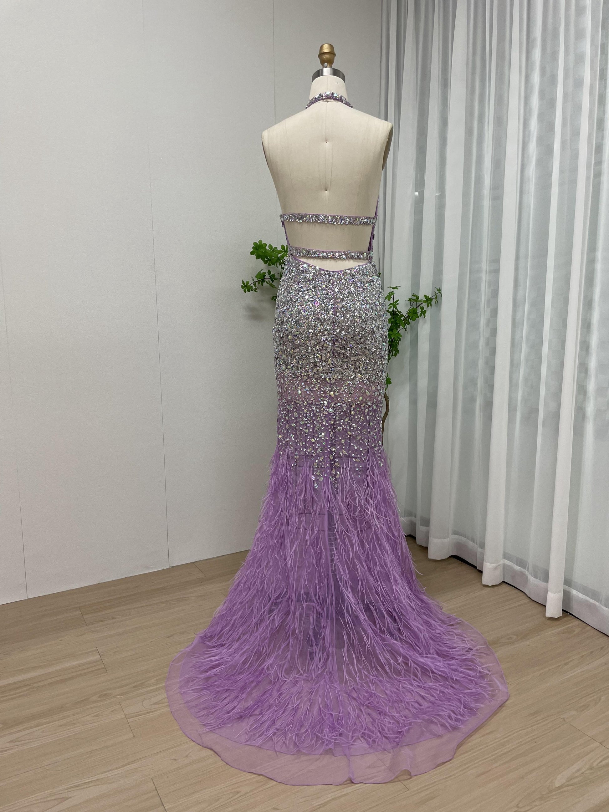 Sparkle Halter Neck Crystal Beading Mermaid Feather Evening Dress MB40101