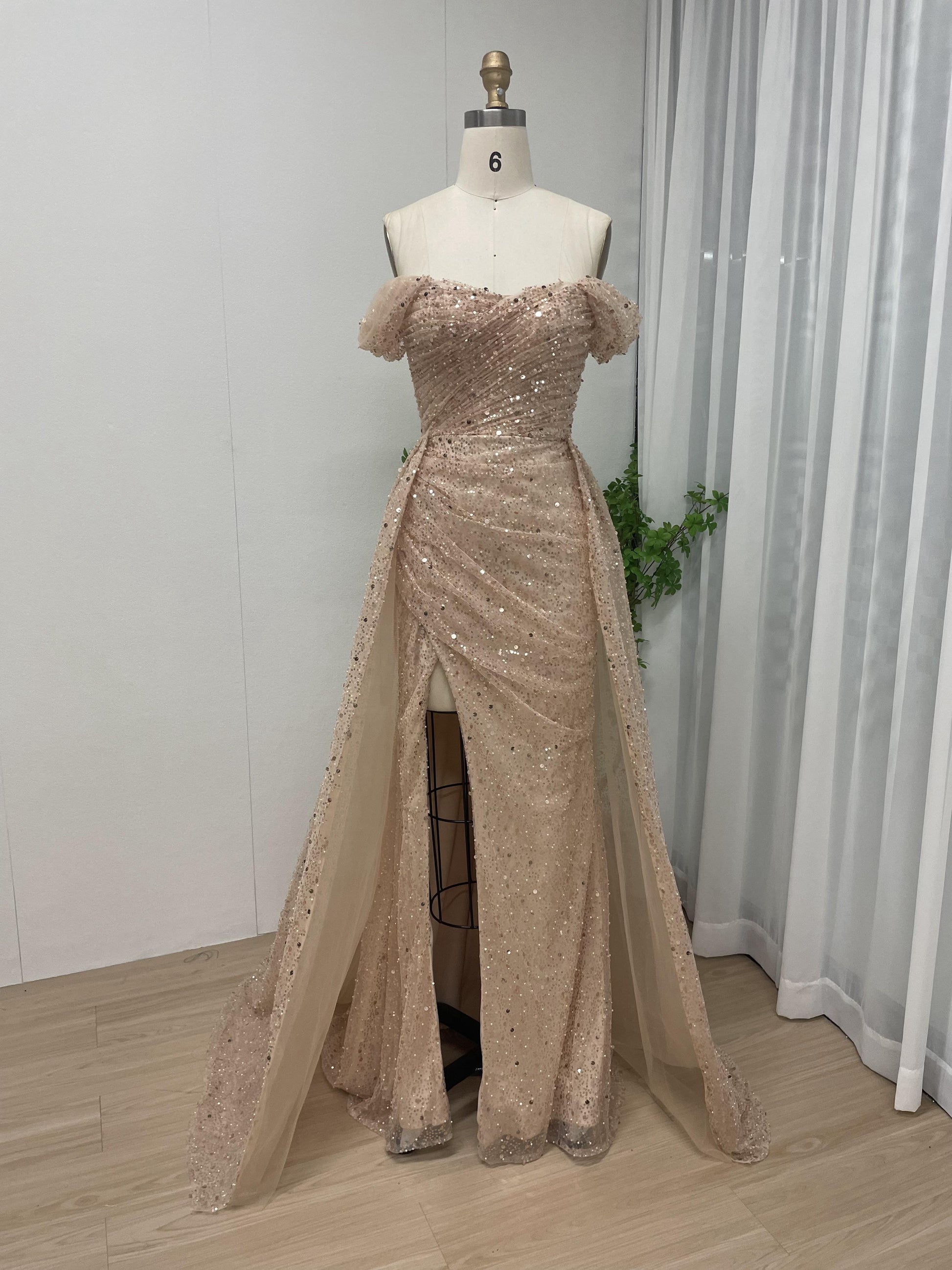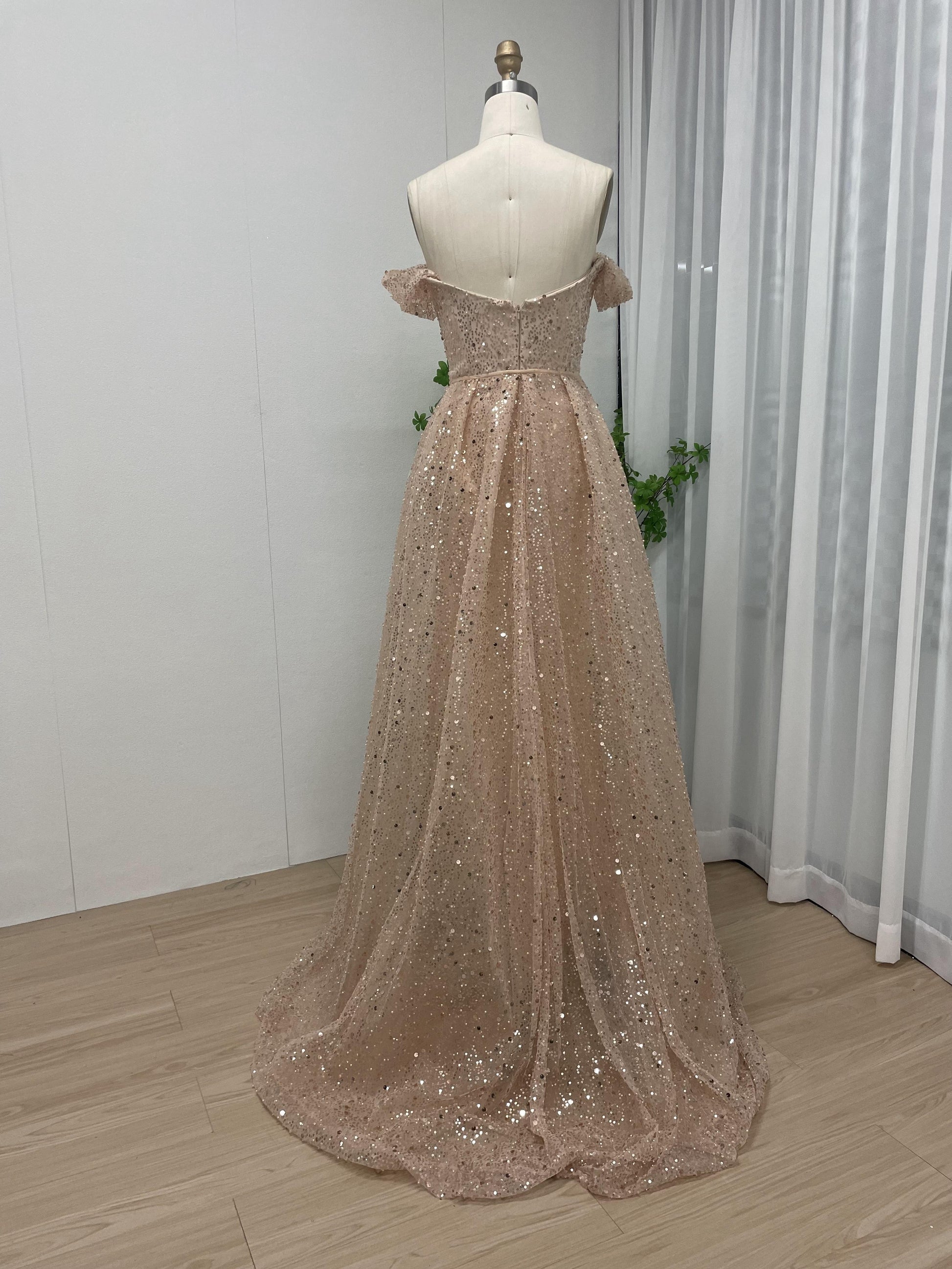Sparkle Off Shoulder Champagne Pink Pleated Formal Dress With Overskirt MB40169