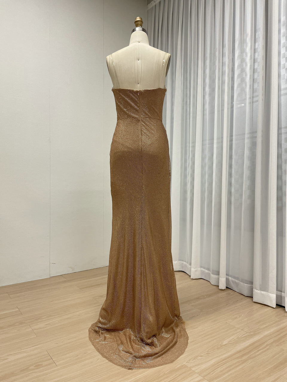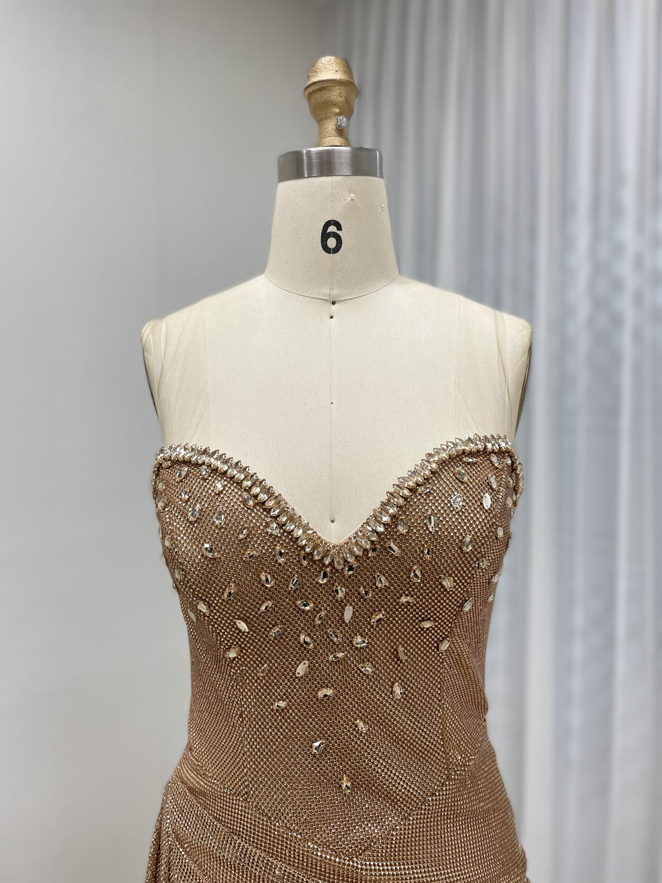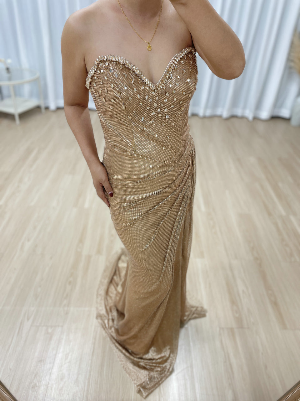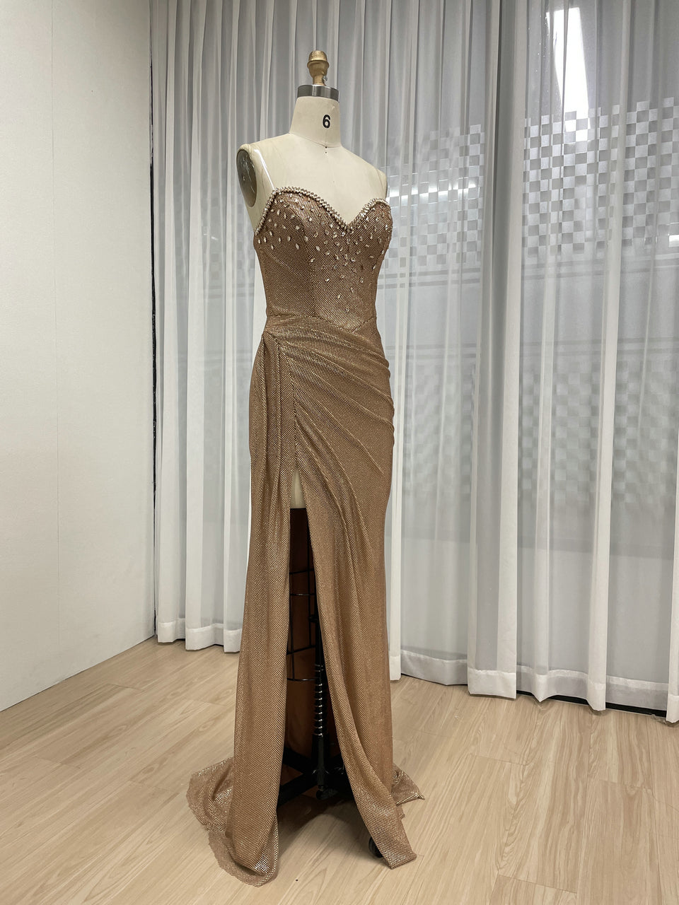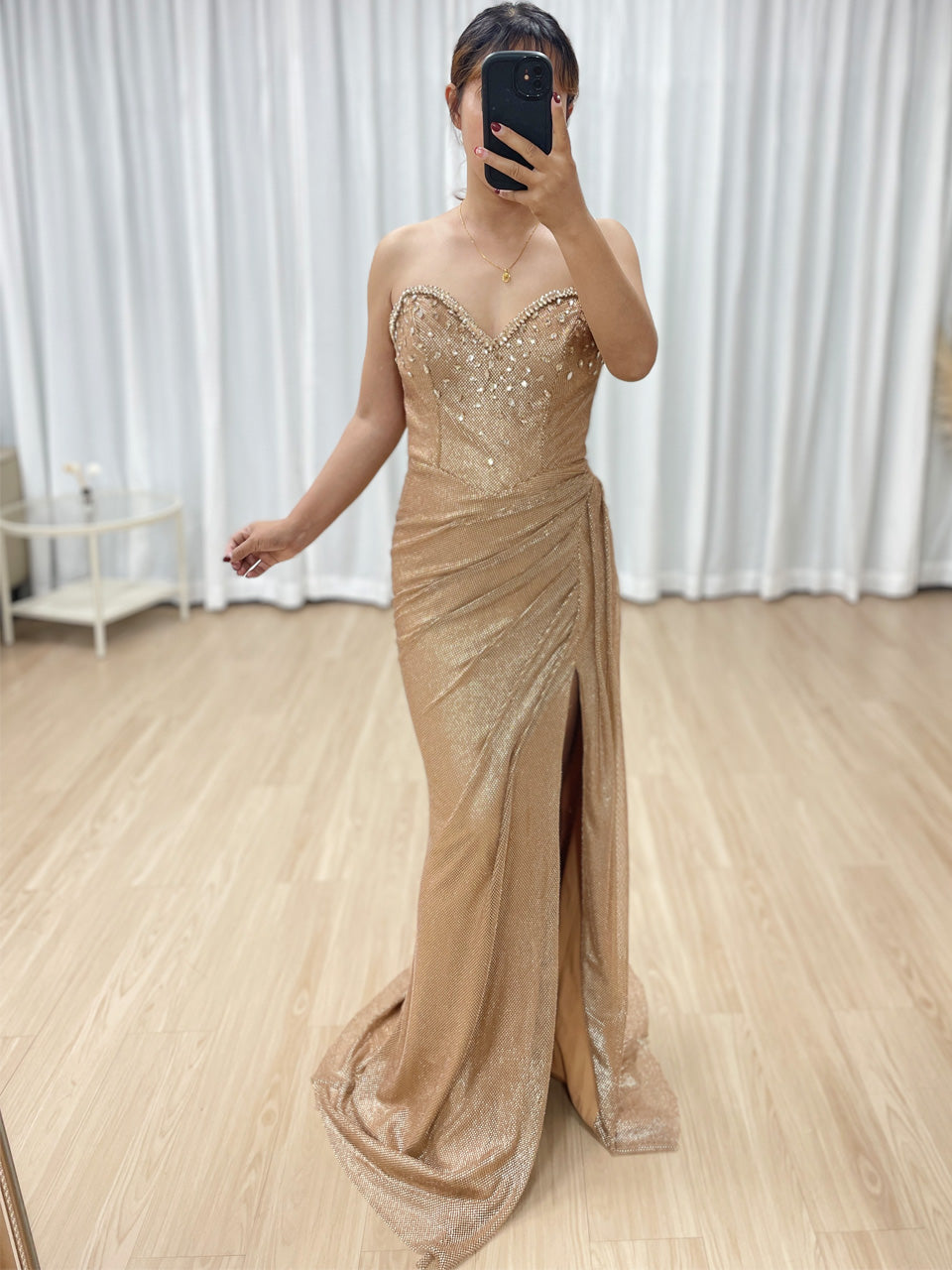 Sparkling Gold Sweetheart Neck Evening Gown High Leg Slit Gathered Fabric Mermaid Fit Banquet Dress for Events MY30145