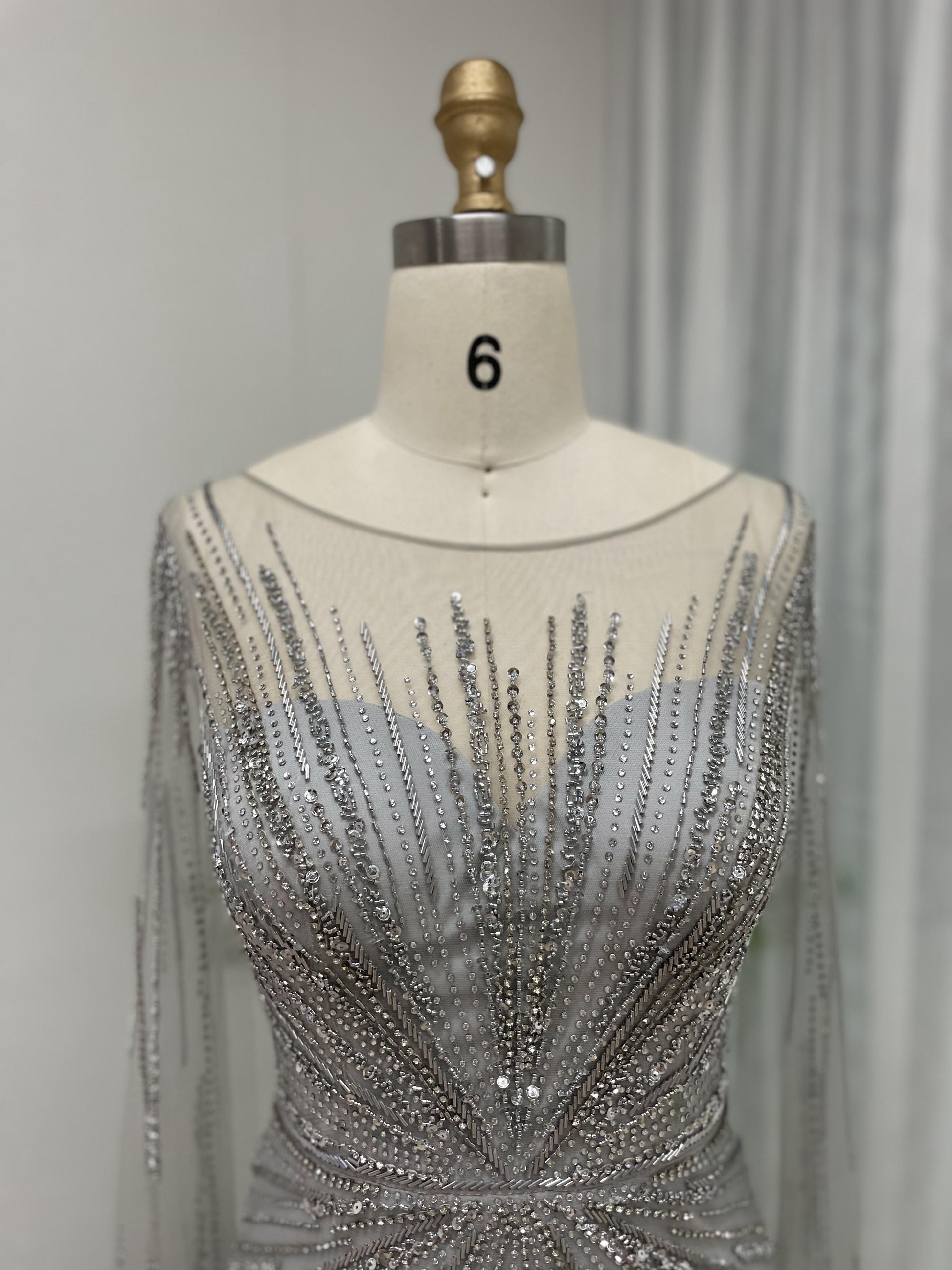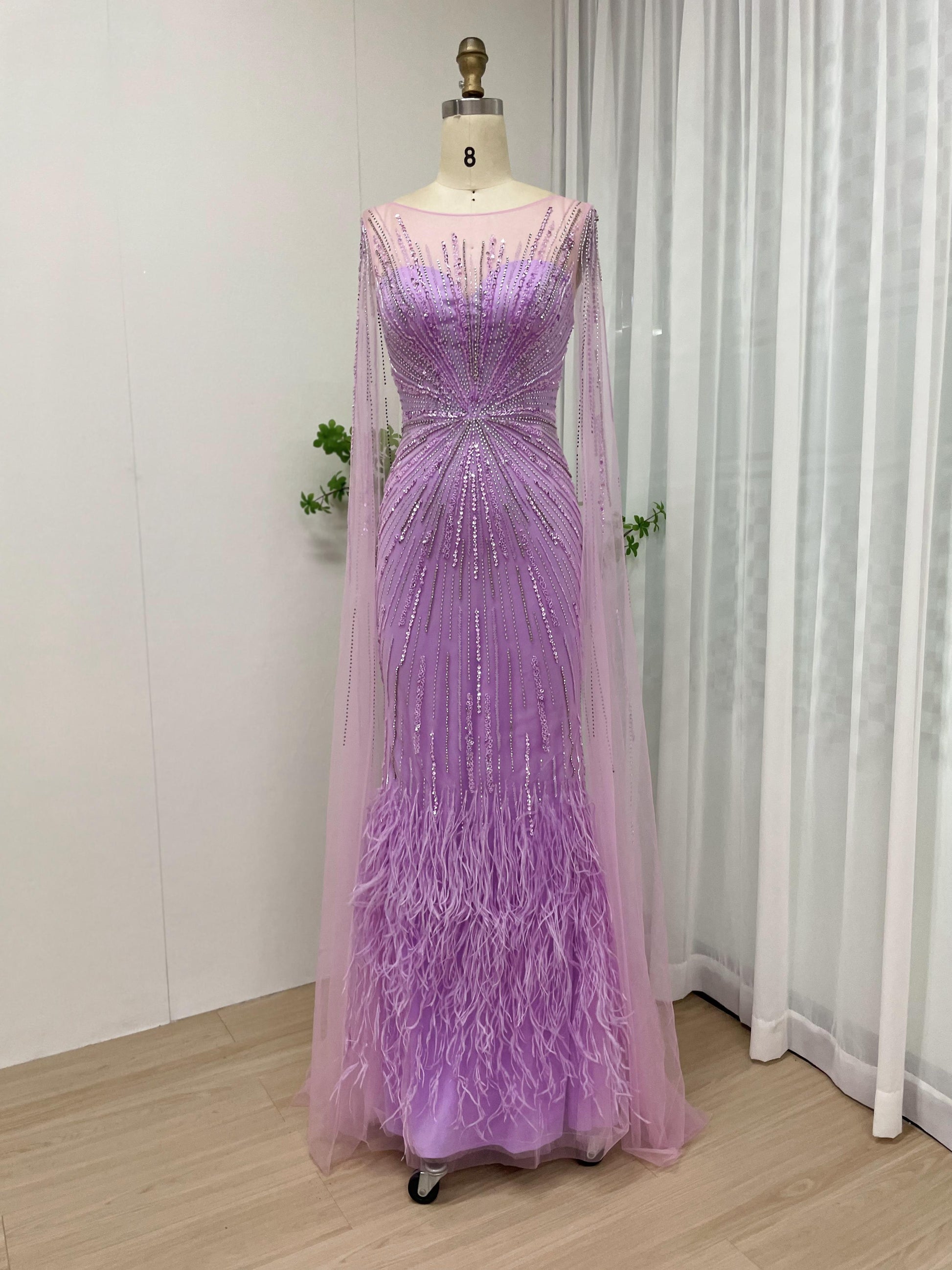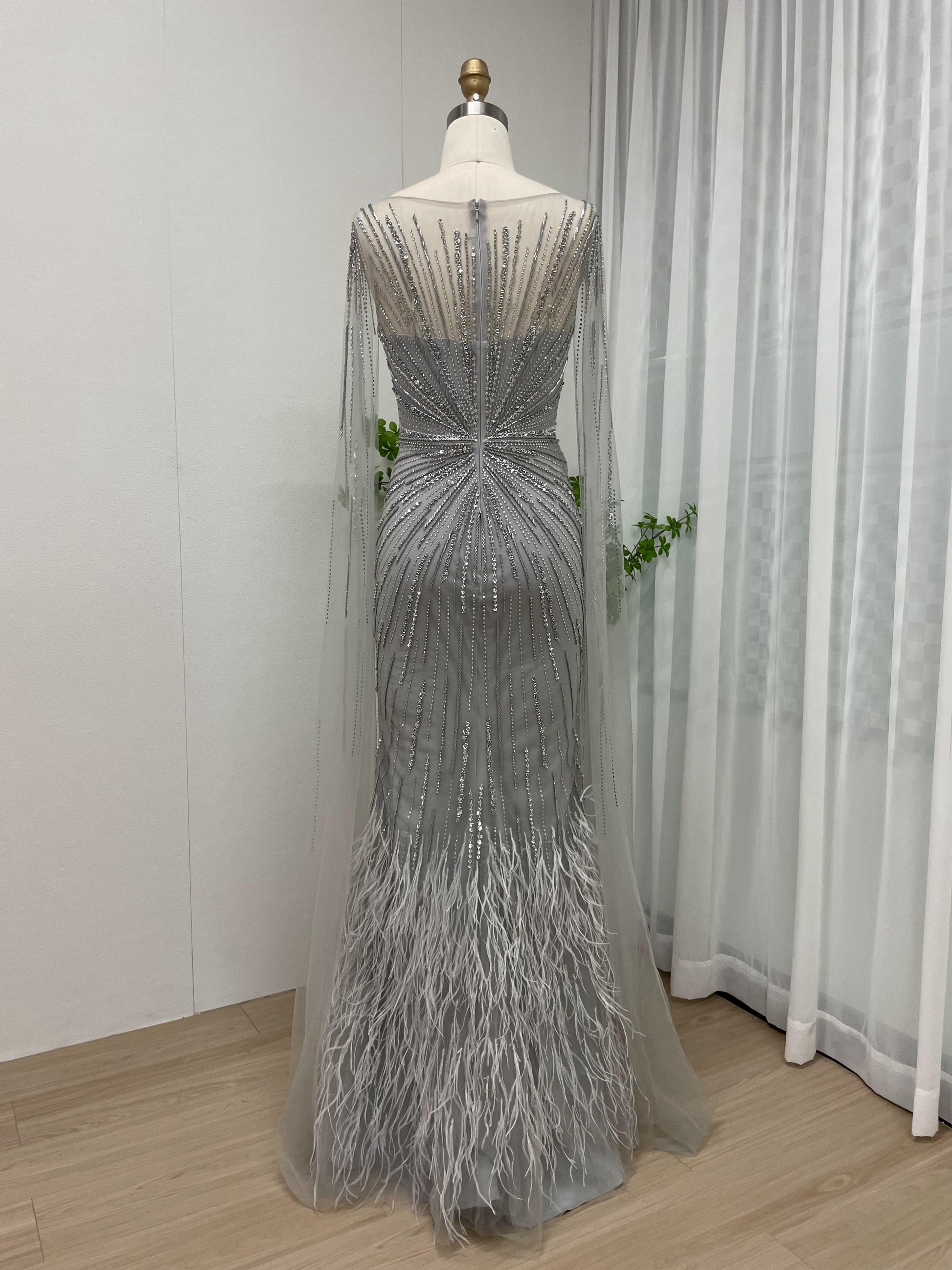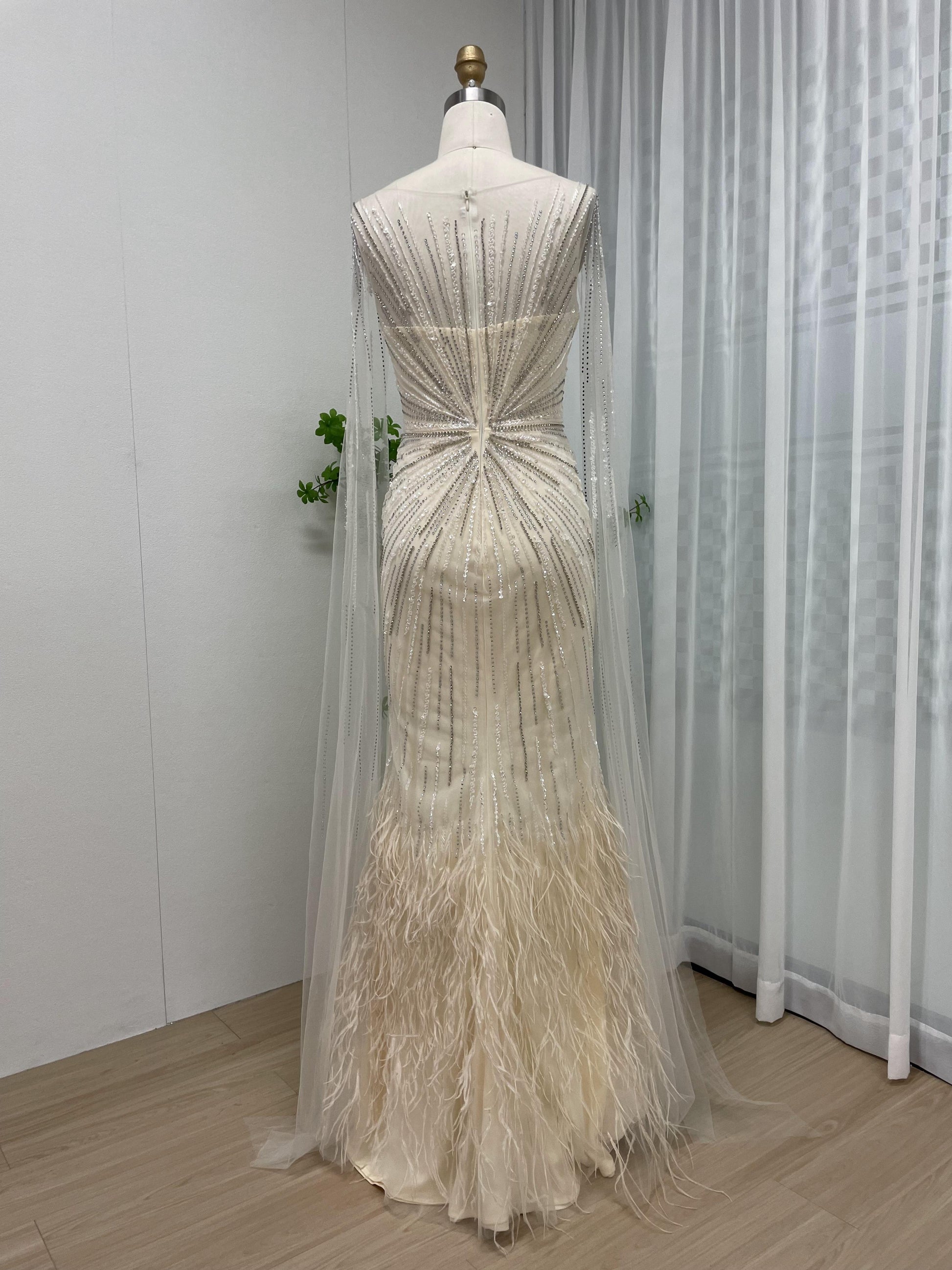 Stunning Sheer Beading Cape Sleeve Feather Skirt Evening Dress MB40099