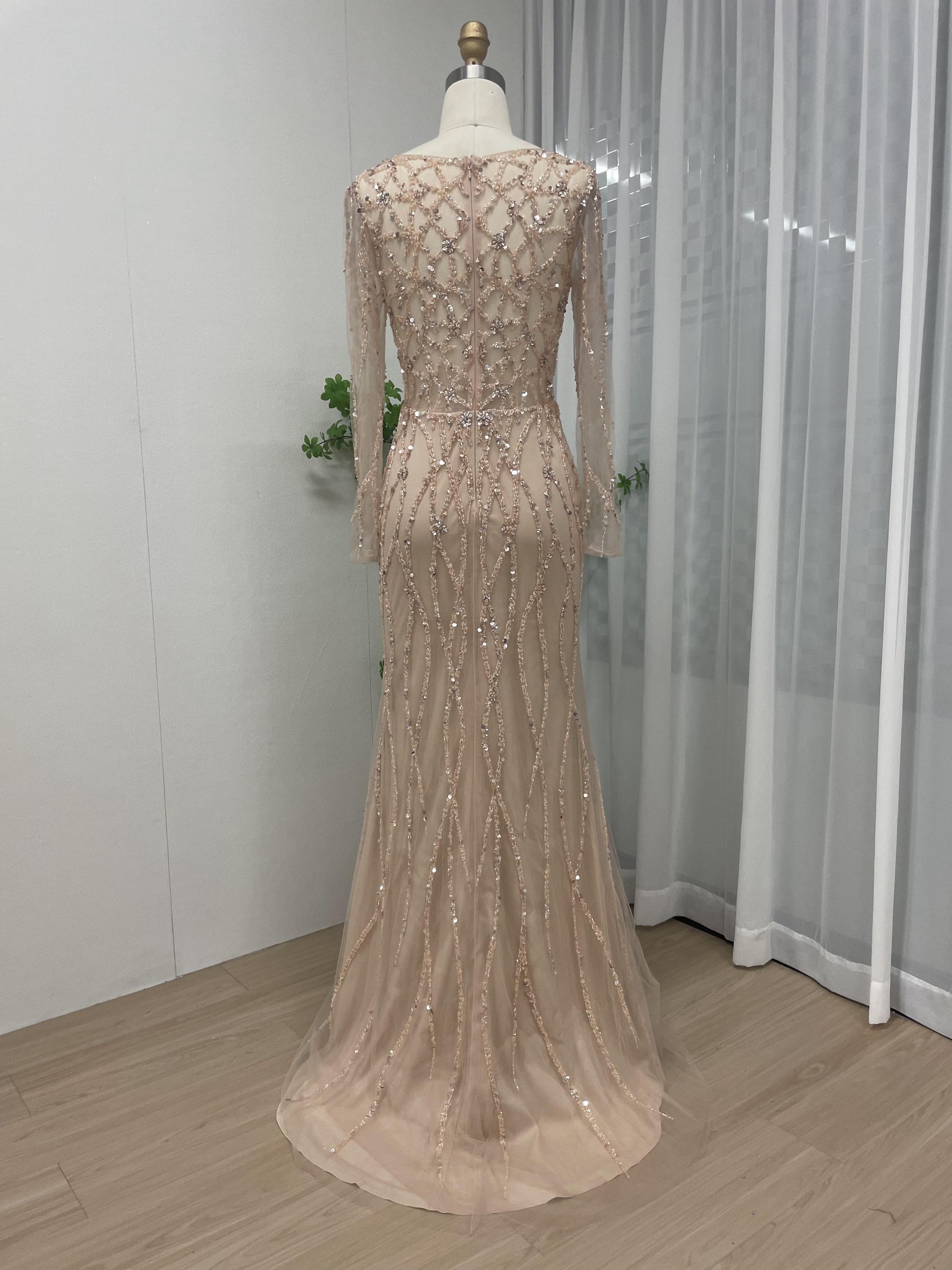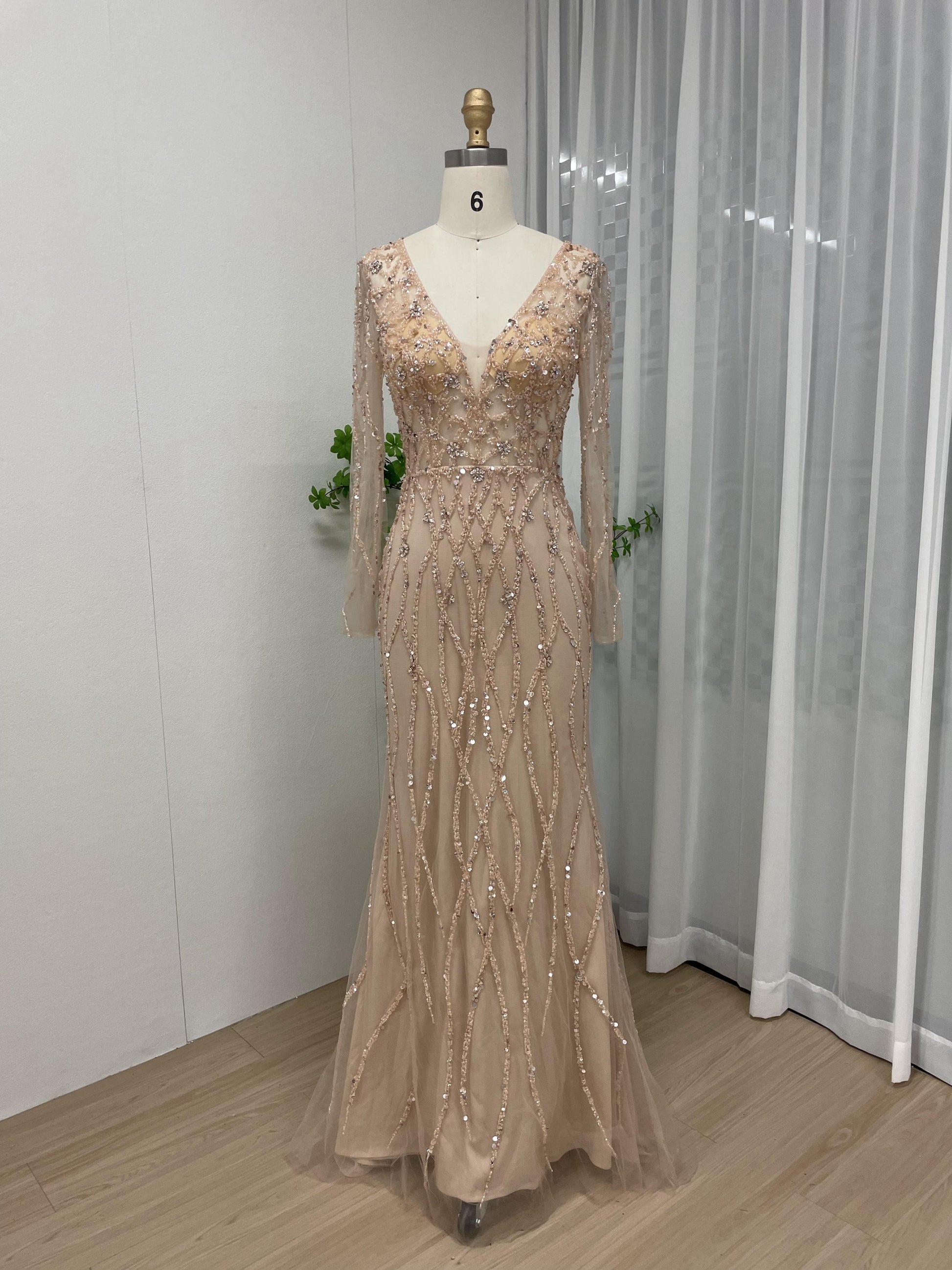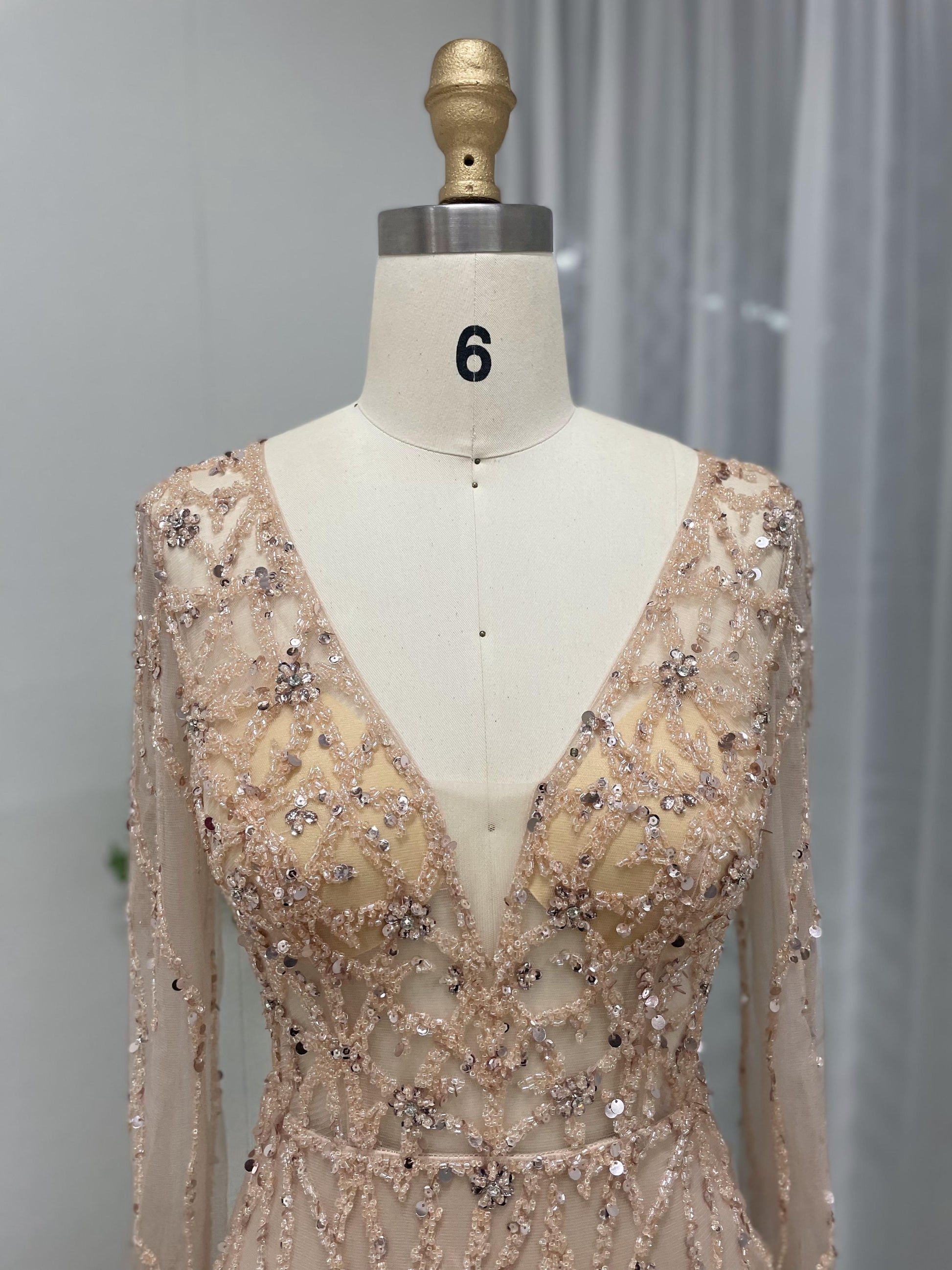 Stunning V Neck Beading Couture Long Sleeve Evening Dress MB40114