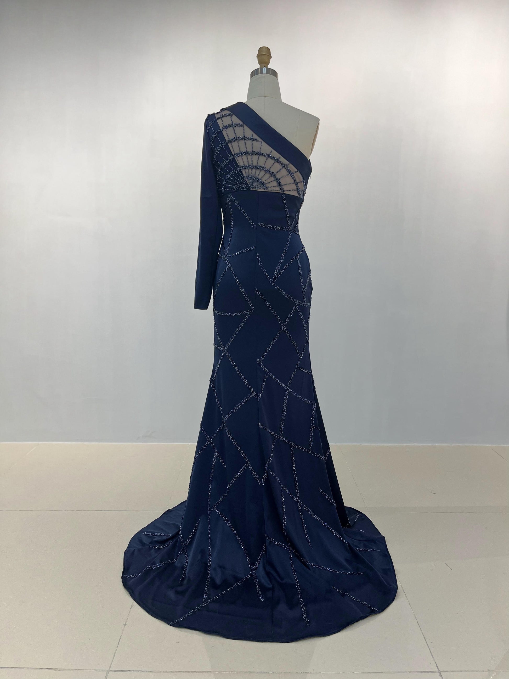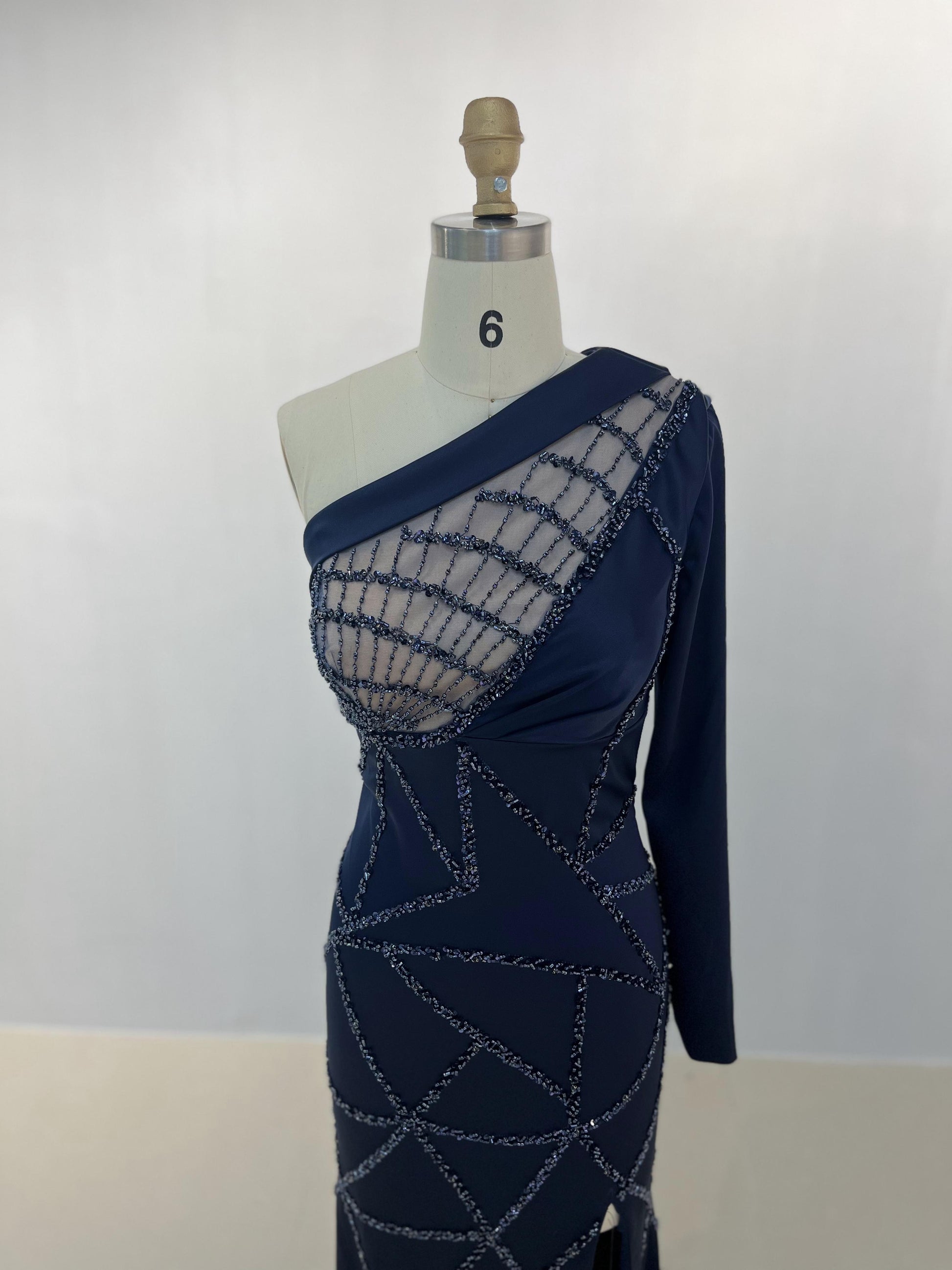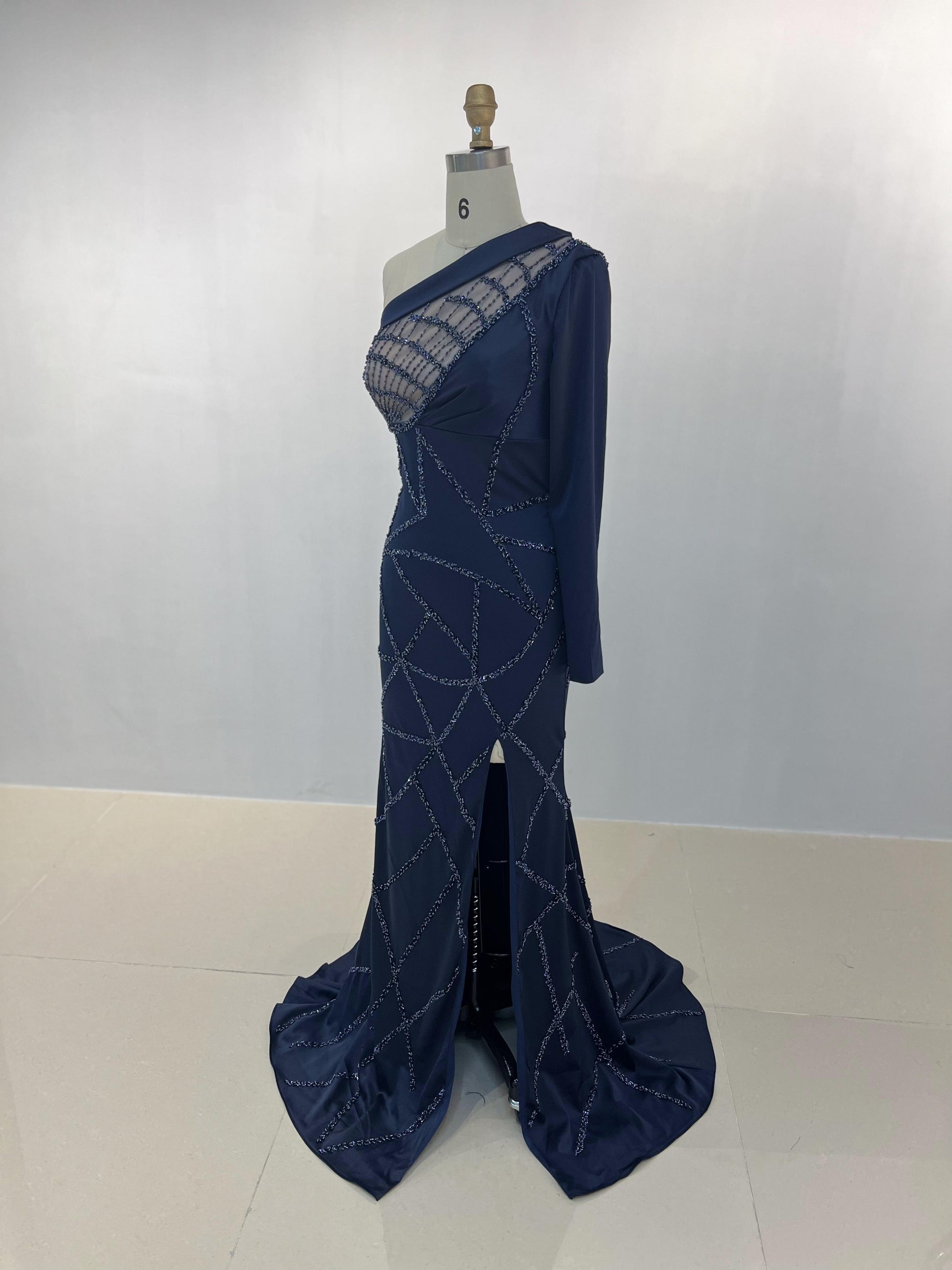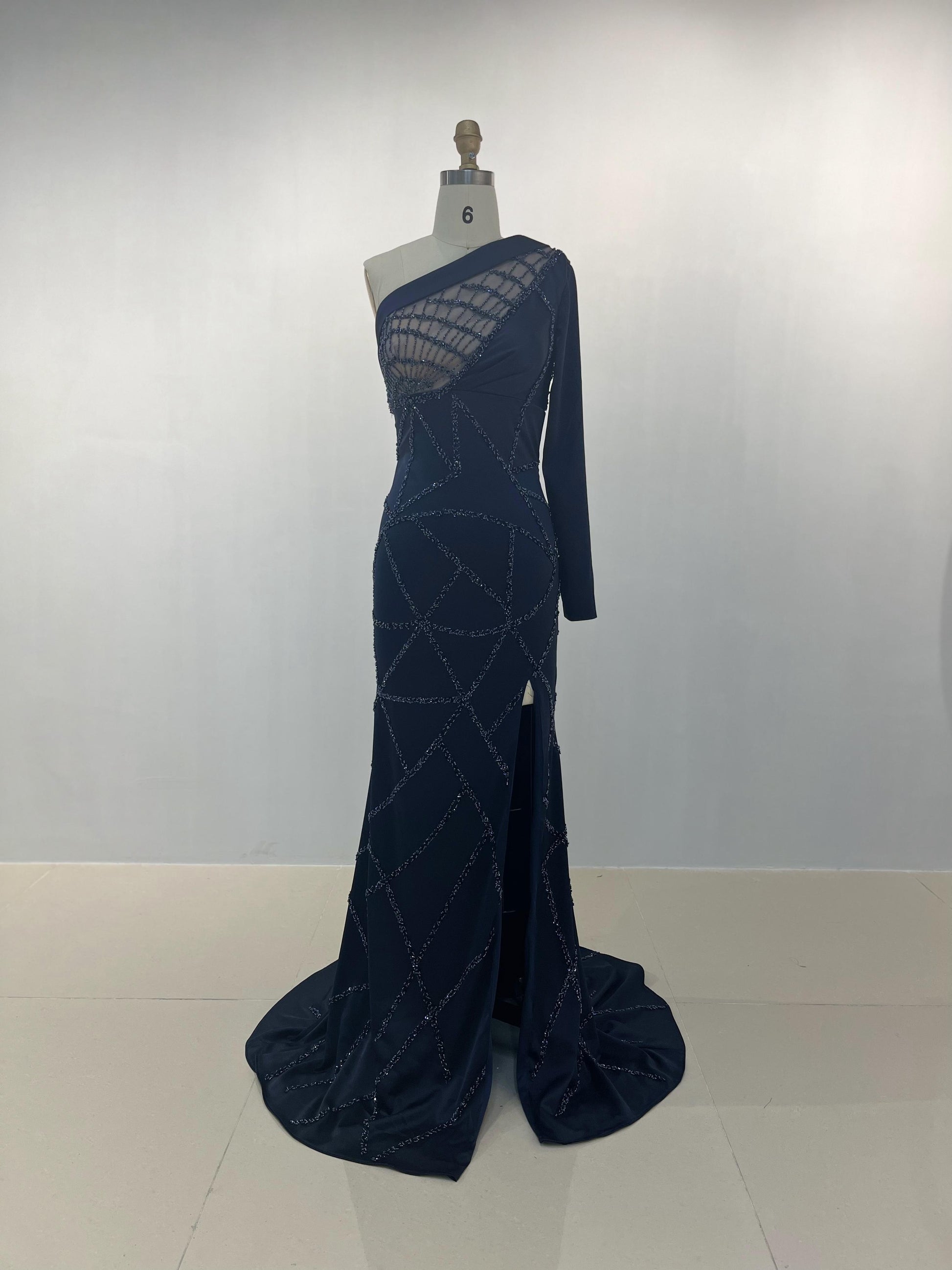 Stylish One Shoulder Sheer Beading High Split Wedding Party Evening Dress AM22210